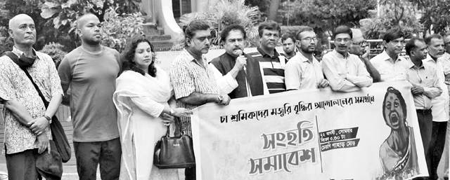 চা শ্রমিকদের মজুরি বৃদ্ধির যৌক্তিক দাবি অবিলম্বে মেনে নিয়ে তাদের জীবনধারণের জন্য প্রয়োজনীয় সকল সুবিধা নিশ্চিত করার দাবি জানানো হয়েছে সচেতন নাগরিকবৃন্দ, চট্টগ্রাম আয়োজিত সমাবেশ থেকে। গতকাল সোমবার নগরীর চেরাগী পাহাড় মোড়ে এই সমাবেশ অনুষ্ঠিত হয়। সমাবেশে বক্তারা বলেন, বছরের পর বছর ধরে চা শ্রমিকরা নির্যাতন-নিপীড়ণ, শোষণ-বঞ্চনা-বৈষম্যের শিকার হয়ে আসছেন। চা বাগানের মালিকরা শ্রমিকদের রক্তের উপর হাজার হাজার কোটি টাকার সম্পদ গড়েছেন। অবিলম্বে চা শ্রমিকদের মজুরি বৃদ্ধিসহ সকল যৌক্তিক দাবি মেনে নিয়ে তাদের জীবনধারণের জন্য প্রয়োজনীয় সকল সুবিধা নিশ্চিত করার দাবি জানানো হয়। সমাবেশে বক্তব্য দেন, বীর মুক্তিযোদ্ধা ডা. মাহফুজুর রহমান, দক্ষিণ জেলা আওয়ামী লীগের সাধারণ সম্পাদক মফিজুর রহমান, নাট্যকার প্রদীপ দেওয়ানজী, প্রকৌশলী দেলোয়ার মজুমদার, ওয়ার্কার্স পার্টির চট্টগ্রাম জেলার সাধারণ সম্পাদক শরীফ চৌহান, ন্যাপ নেতা মিটুল দাশগুপ্ত, সাংবাদিক মহসীন কাজী, জাসদ নেতা জসিম উদ্দিন বাবুল, ফজলুল কবির মিন্টু, আবৃত্তি শিল্পী রাশেদ হাসান। সাংবাদিক প্রীতম দাশের সঞ্চালনায় সমাবেশে আরো বক্তব্য দেন, প্রণব চৌধুরী, রাশেদুল সামির, সাংবাদিক অনুপম শীল, সাংবাদিক সোলাইমান আকাশ, সিঞ্চন ভৌমিক, আবিদুর রহমান। উপস্থিত ছিলেন সাংবাদিক ঋতিক নয়ন, মিঠুন চৌধুরী, আমিনুল ইসলাম মুন্না, মিনহাজুল ইসলাম, সজল চৌধুরী, আর কে দাশ, মিনু মিত্র, মোহাম্মদ জাফর, মো. রিয়াদ প্রমুখ। প্রেস বিজ্ঞপ্তি।