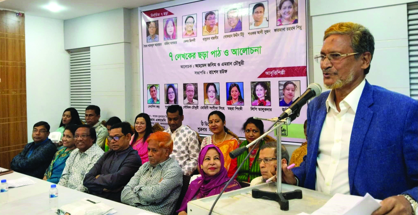 সাত লেখকের ছড়া পাঠ ও আলোচনা শীর্ষক অনুষ্ঠানে বক্তারা বলেছেন, একসময় বাংলা ছড়া কাজ করেছে প্রধানত শিশুরঞ্জনী হিসেবে। নির্মল সাহিত্য–রস পরিবেশনের পাশাপাশি শিশুদের নৈতিক শিক্ষাদানের প্রতি সে সময় বিশেষ সচেতনতা ছিলো। স্বাধীনতা পরবর্তীকালে বাংলা ছড়া আধুনিক রূপে–গন্ধে পূর্ণতা লাভ করেছে। ছড়ার জনপ্রিয়তা আকাশচুম্বী। আজকালের ছড়ার চেহারায় আলাদা সৌন্দর্য এসেছে, ছড়াকে শুধু শিশুতোষ ভাবার দৃষ্টিভঙ্গি পরিবর্তিত হয়েছে, বক্তব্যের বলিষ্ঠতা এসেছে। ছড়া মেটাচ্ছে সময়ের দাবি। তাঁরা বলেন, ছড়ার উৎস হচ্ছে মানুষ। তার শেকড় সাধারণ মানুষের মনের মধ্যেই প্রোথিত।
