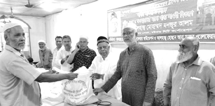 আহলে বায়েতে রাসূল (সা.) স্মরণে শোহদায়ে কারবালা উপলক্ষে সাবেক মেয়র মোহাম্মদ মনজুর আল প্রতিষ্ঠিত হোছনে আরা মনজুর ওয়েলফেয়ার ট্রাস্টের উদ্যোগে নগরীর ১০, ১১, ১২, ১৪, ২৫ ও ২৬নং ওয়ার্ড, দেওয়ানহাট দীঘির পাড় এবং সিটি গেটস্থ এইচ এম ভবনে অসচ্ছল ও নিম্ন আয়ের ৮ হাজার পরিবারকে খাদ্য সামগ্রী বিতরণ করেন। ১১নং ওয়ার্ডের লাকী স্কয়ার সেন্টার, ১২নং ওয়ার্ডের কলেজ মাঠে, ২৪নং ওয়ার্ডের কর্ণফুলী কমিউনিটি সেন্টার এবং ২৬নং ওয়ার্ডের কংস কমিউনিটি সেন্টারে খাদ্য সামগ্রী বিতরণ উপলক্ষে সমাবেশে সাবেক মেয়র মোহাম্মদ মনজুর আলম, হোছনে আরা মনজুর ওয়েলফেয়ার ট্রাস্টের সভাপতি মোহাম্মদ নিজামুল আলম, নির্বাহী পরিচালক মোহাম্মদ সরোয়ার আলম, পরিচালক মোহাম্মদ সাইফুল আলম, মোহাম্মদ সাহিদুল আলম, লায়ন মোহাম্মদ হোসেন, অধ্যক্ষ আসলাম হোসেন, সৈয়দ মোহাম্মদ জাকারিয়া, কাউন্সিলর নুরুল আমিন, লোকমান আলী, সাবেক কমিশনার সিরাজুল ইসলাম, লায়ন শওকত আলী, সৈয়দ আবেদ আব্দুল্লাহ মনজুর আলম, বাদশা আলম বক্তব্য দেন। প্রতিটি সভায় পবিত্র কোরআন থেকে তেলোয়াত, দোয়া মাহফিল ও মোনাজাত অনুষ্ঠিত হয়। খাদ্য বিতরণ অনুষ্ঠানে সাবেক মেয়র মোহাম্মদ মনজুর আলম বলেন, কারবালার ঘটনা ছিল সত্য ও ন্যায়ের সংগ্রাম। সত্য ও ইসলাম সুপ্রতিষ্ঠায় হযরত ইমাম হোসাইন (র.) যে ত্যাগ স্বীকার করেছেন তা পৃথিবীর ইতিহাসে বিরল দৃষ্টান্ত। দোয়া মাহফিল ও মোনাজাত পরিচালনায় ছিলেন সৈয়্যদ ইউনুস রজভী, মাওলানা আবদুল মান্নান ও মাওলানা রাশেদুল হক। প্রেস বিজ্ঞপ্তি।