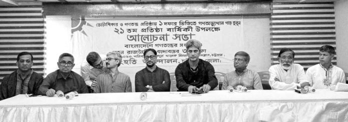 গণসংহতি আন্দোলনের ২১তম প্রতিষ্ঠাবার্ষিকী উপলক্ষে চট্টগ্রাম জেলা শাখা গতকাল শনিবার চট্টগ্রাম প্রেস ক্লাবে আলোচনা সভার আয়োজন করেছে। জেলা সমন্বয়কারী হাসান মারুফ রুমীর সভাপতিত্বে এতে প্রধান অতিথি ছিলেন গণসংহতি আন্দোলনের কেন্দ্রীয় প্রধান সমন্বয়কারী জোনায়েদ সাকি।