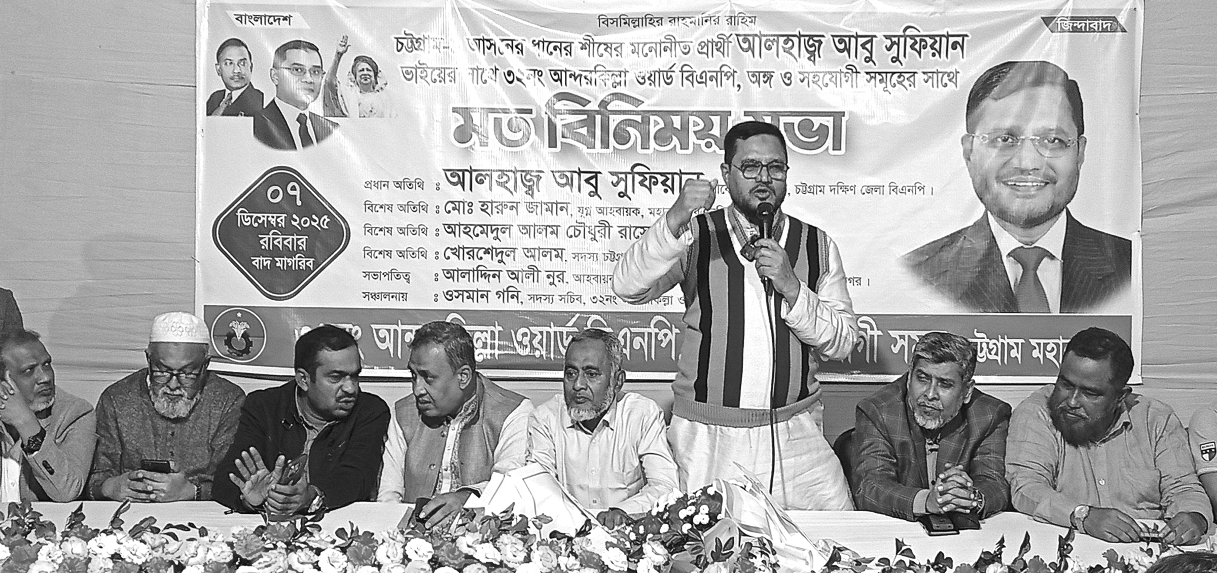দক্ষিণ জেলা বিএনপির সাবেক আহবায়ক আবু সুফিয়ান বলেছেন, বিএনপির শক্তি, বিএনপির সাহস ও বিএনপির মনোবল হচ্ছে এদেশের জনগণ। তিনি আরো বলেন, জনদুর্ভোগ সৃষ্টি নয়,জনগণের কল্যাণে কাজ করতে হবে। জনগণ ধানের শীষে ভোট দেওয়ার জন্য উন্মুখ হয়ে আছে। আমাদের দায়িত্ব হচ্ছে জনগণকে সংগঠিত করে ভোট কেন্দ্রে নিয়ে যাওয়া। আগামী নির্বাচনে জনগণের ভোটে ধানের শীষের নিরঙ্কুশ বিজয় হবে। তিনি এ লক্ষ্যে ঐক্যবদ্ধভাবে কাজ করার জন্য নেতাকর্মীদের প্রতি আহবান জানান। তিনি গতকাল সোমবার আন্দরকিল্লা ওয়ার্ড বিএনপি ও অঙ্গ সংগঠনের উদ্যোগে আয়োজিত মতবিনিময় সভায় প্রধান অতিথির বক্তব্যে এসব কথা বলেন। সভায় বিশেষ অতিথি ছিলেন মহানগর বিএনপির যু্গ্ম আহবায়ক হারুন জামান, ইয়াছিন চৌধুরী লিটন, আহমেদুল আলম চৌধুরী লিটন, খোরশেদ আলম চৌধুরী, আনোয়ার হোসেন লিপু, মঞ্জুর রহমান চৌধুরী, জাকির হোসেন, হেলাল চৌধুরী। ওয়ার্ড বিএনপির সদস্য সচিব ওসমান গণি ও যু্গ্ম আহবায়ক কলিম উদ্দিনের সঞ্চালনায় এতে বক্তব্য রাখেন মো. আজগর, নুরুল আজিম হিরু, নুরুল আলম, প্রশান্ত কুমার পাণ্ডে, আজগর আলী, আসাদুর রহমান টিটু, নুরুল গনি, এম এ হামিদ, নকিব উদ্দিন ভুইয়া, গিয়াস উদ্দিন ভুইয়া, আবুল বশর,ওয়াকিল আহমদ, হেলাল উদ্দিন, মো. শাহাজাহান, জাহাঙ্গীর রেজা, লিটন দাশ, মো. রেজা, মো. আরিফ, মো. সালাউদ্দিন, বাবু পাণ্ডে প্রমুখ। প্রেস বিজ্ঞপ্তি।