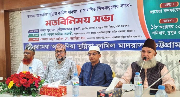 জামেয়া আহ্‌মদিয়া সুন্নিয়া কামিল মাদরাসায় শিক্ষকদের প্রশিক্ষণ ও মতবিনিময় সভা গতকাল শনিবার কনফারেন্স কক্ষে অনুষ্ঠিত হয়। সভায় প্রধান অতিথি ছিলেন কারিগরি ও মাদরাসা বিভাগের যুগ্মসচিব মুহাম্মদ মুনীরুজ্জামান ভূঁঞা। সভা উদ্বোধন করেন কাজী আব্দুল আলীম রেজভী। সভাপতিত্ব করেন মাদরাসার পরিচালনা পর্ষদের চেয়ারম্যান প্রফেসর আবুল মহসিন মো. ইয়াহিয়া খান। প্রধান অতিথি বলেন, মাদরাসা শিক্ষার উন্নয়নে আমরা দিনরাত নিরলস প্রচেষ্টা চালিয়ে যাচ্ছি। জামেয়া আহমদিয়া সুন্নিয়া কামিল মাদরাসা সম্পর্কে পূর্ব হতেই অবহিত রয়েছি। অত্র প্রতিষ্ঠান যেভাবে মাদরাসা শিক্ষার মাধ্যমে শিক্ষার্থীদের মাঝে জ্ঞানের আলো ছড়িয়ে দিচ্ছে তা ভবিষ্যতে আরো বেগবান হবে বলে আমি বিশ্বাস করি। সকলের প্রচেষ্টায় মাদরাসা শিক্ষা কাঙ্ক্ষিত লক্ষ্যে পৌছাতে পারব বলে আমি বিশ্বাস করি। সভাপতি বলেন, আমাদের সকল প্রকার কার্যক্রম অনলাইন ভিত্তিক সম্পন্ন করা হয়। মাদরাসার শিক্ষার্থীদের পড়ালেখার মানোন্নয়নে আনজুমান ট্রাস্ট, গভর্নিং বডি, শিক্ষক, শিক্ষার্থী ও অভিভাবকদের সাথে নিয়মিত মতবিনিময় সভার মাধ্যমে নিবিড় যোগাযোগ করা হয়। তিনি মাদরাসার অবকাঠামোগত উন্নয়নে সার্বিক সহযোগিতা কামনা করেন। প্রেস বিজ্ঞপ্তি।