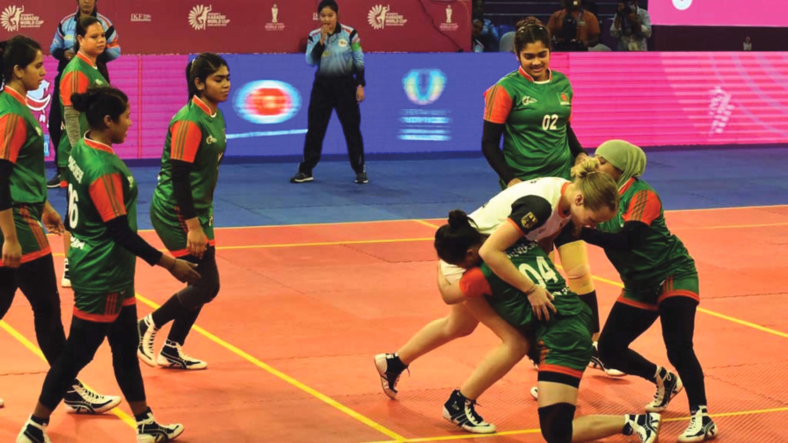 নারী কাবাডি বিশ্বকাপে মঙ্গলবার বাংলাদেশ ৫৭–২৭ পয়েন্টে হারিয়েছে জার্মানিকে। আগের দিন উগান্ডাকে ৪৪–২২ পয়েন্টে উড়িয়ে গ্রুপ পর্ব শুরু করেছিল স্বাগতিকরা। বোনাস পয়েন্ট পেয়ে শুরু করা বাংলাদেশ পাঁচ মিনিটের মধ্যেই জার্মানিকে একদফা অল আউট করে দেয়। ম্যাচের বাকিটা সময়েও আধিপত্য ধরে রেখে নারী কাবাডি বিশ্বকাপে টানা দ্বিতীয় জয় তুলে নিল স্মৃতি–রূপালিরা। প্রথমার্ধে জার্মানিকে চেপে ধরে দ্বাদশ মিনিটের মধ্যেই দুইবার অল আউট করে বাংলাদেশ। তারা তখন এগিয়ে ছিল ২২–৫ পয়েন্টে। ১৯ পয়েন্টে এগিয়ে থেকে বিরতিতে যায় বাংলাদেশ। দ্বিতীয়ার্ধে জার্মানি কিছুটা প্রতিরোধ গড়ে, তবে উজ্জীবিত বাংলাদেশকে আটকানোর জন্য তা যথেষ্ট ছিল না। এই অর্ধেও প্রতিপক্ষকে দুইবার অল আউট করেন শ্রাবণী–বৃষ্টিরা। নিজেদের তৃতীয় ম্যাচে আজ বুধবার বিশ্বকাপের শিরোপাধারী ভারতের মুখোমুখি হবে বাংলাদেশ।