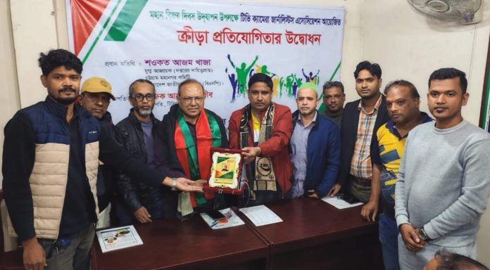 মহান বিজয় দিবস–২০২৫ উপলক্ষে টিভি ক্যামেরা জার্নালিস্টস এসোসিয়েশন (টিসিজেএ), চট্টগ্রাম আয়োজিত ক্রীড়া প্রতিযোগিতা শুরু হয়েছে। গত ১৬ ডিসেম্বর মঙ্গলবার সন্ধ্যায় টিসিজেএ মিলনায়তনে প্রতিযোগিতার উদ্বোধন করেন প্রধান অতিথি চট্টগ্রাম মহানগর বিএনপির যুগ্ম আহ্বায়ক (দপ্তর) শওকত আজম খাজা। উদ্বোধনী অনুষ্ঠানে সভাপতিত্ব করেন সংগঠনের সভাপতি শফিক আহমেদ সাজীব। সহ–সাধারণ সম্পাদক মোহাম্মদ আলমগীরের সঞ্চালনায় অনুষ্ঠানে বিশেষ অতিথি হিসেবে উপস্থিত ছিলেন চট্টগ্রাম মহানগর বিএনপির যুগ্ম আহ্বায়ক (প্রচার) শিহাব উদ্দিন মুবিন। এতে আরও বক্তব্য রাখেন টিসিজেএ’র সাবেক সভাপতি এনামুল হক, সহ–সভাপতি মোহাম্মদ আলী আকবর, প্রচার ও প্রকাশনা সম্পাদক সাইমুন আল মুরাদ, নির্বাহী সদস্য মো. সাইফুল ইসলাম সহ সংগঠনের অন্যান্য নেতৃবৃন্দ। পরে ক্রীড়া প্রতিযোগিতার আনুষ্ঠানিক উদ্বোধন করা হয়। এ সময় টিসিজেএ’র সাংগঠনিক সম্পাদক বাসুদেব, দপ্তর সম্পাদক মো. পারভেজ রহমান, নির্বাহী সদস্য মো. নুর হাসিব ইফরাজ, রবিউল হোসেন টিপুসহ সংগঠনের বিভিন্ন পর্যায়ের নেতৃবৃন্দ উপস্থিত ছিলেন।