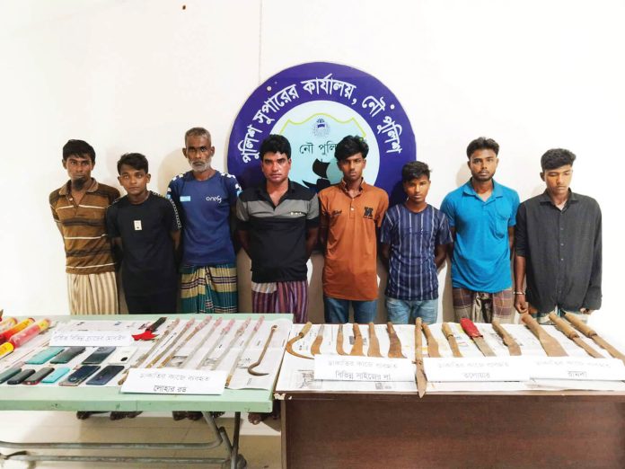 নগরের ফিশারিঘাটের পাশে কর্ণফুলী নদীর তীরে মাছ ধরার একটি ট্রলার থেকে অস্ত্রসহ ৮ জনকে গ্রেপ্তার করেছে নৌ–পুলিশ। তারা ডাকাতির প্রস্তুতি নিচ্ছিল বলে জানায় পুলিশ। ধৃতরা হলেন হরি চন্দ্র দাস (৪০), মো. আসিফ উদ্দিন (২২), মো. ফাহাদ আহাম্মদ (২০), তাপস ধর (২৫) পরিমল সাহা (৪৮), মো. নবী (২৮), মো. রাজীব (২৫), মো. হৃদয় (২০)। তাদের বাড়ি চট্টগ্রাম, লক্ষ্মীপুর ও নোয়াখালীর বিভিন্ন উপজেলায়। গত শনিবার রাাতে তাদের গ্রেপ্তার করা হয়। গ্রেফতার হরি চন্দ্র দাশ ট্রলার মালিক এবং ডাকাত চক্রের দলনেতা। বাকিরা সহযোগী হিসেবে তার নেতৃত্বে ডাকাতি করে। চট্টগ্রাম নৌ পুলিশের সহকারী পুলিশ সুপার সাঈদ ইবনে রেজা জানান, ডাকাতির প্রস্তুতি নিয়ে সাগরে রওনা দেওয়ার জন্য একটি চক্র ট্রলারে অপেক্ষমাণ আছে–এমন তথ্যের ভিত্তিতে ফিশারিঘাট লোহার ব্রিজ সংলগ্ন এলাকায় নোঙর করে রাখা একটি মাছ ধরার ট্রলারে অভিযান শুরু করে নৌ পুলিশ। এ সময় সেখান থেকে কয়েকজন পালিয়ে যেতে সক্ষম হলেও সাতজনকে আটক করা হয়। তাদের তথ্যে ট্রলারের ইঞ্জিন রুম থেকে বিভিন্ন ধরনের ধারালো অস্ত্র উদ্ধার করা হয়। এরপর সদরঘাট এলাকার একটি আবাসিক হোটেল থেকে ট্রলার মালিক হরি চন্দ্রকে গ্রেপ্তার করা হয়। তিনি জানান, এটি একটি সংঘবদ্ধ চক্র। বঙ্গোপসাগরের হাতিয়া, সন্দ্বীপ, কুমিরা চ্যানেলে এবং কর্ণফুলী নদীর পতেঙ্গা, বাকলিয়া, কর্ণফুলী এলাকায় বিভিন্ন মাছ ধরার ট্রলার টার্গেট করে। পরে সেগুলোর সামনে গিয়ে রকেট ফ্লেয়ার বিষ্ফোরণ ঘটিয়ে বল্লমসহ ধারালো অস্ত্র নিয়ে উঠে পড়ে মাছসহ বিভিন্ন মালামাল লুট করে। এ চক্রটি এক মাসে দুইবার বিভিন্ন ট্রলারে ডাকাতি করেছে।