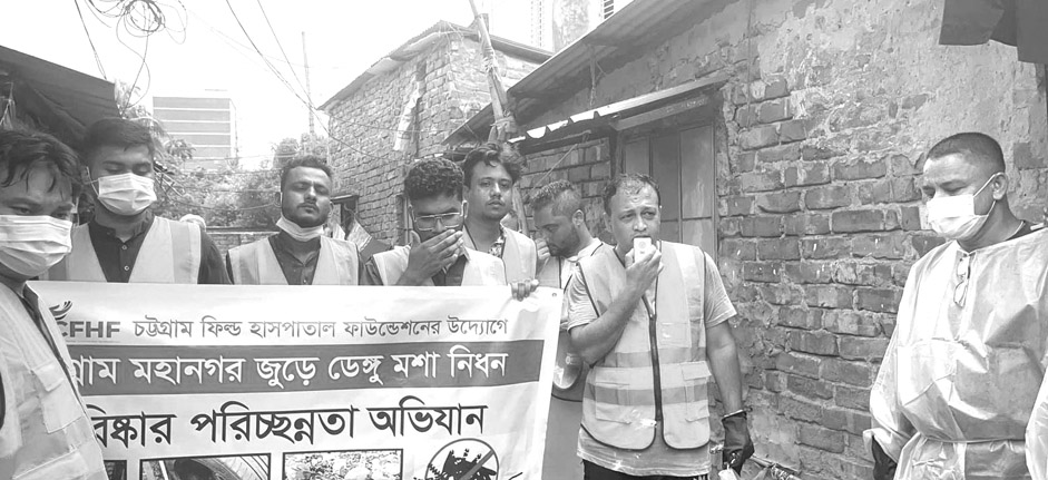 চট্টগ্রাম ফিল্ড হাসপাতাল ফাউন্ডেশনের উদ্যোগে জনস্বাস্থ্য বিশেষজ্ঞ ডা. বিদ্যুৎ বড়ুয়ার সার্বিক ব্যবস্থাপনায় চট্টগ্রাম মহানগরের ১৩নং ওয়ার্ডের দক্ষিণ খুলশী এলাকায় ঝাউতলা ও আমবাগান সুবিধাবঞ্চিত মানুষের আবাসস্থলে ডেঙ্গু মশা নিধনে প্রতিকী ডেঙ্গু সচেতনতামূলক ড্রেনে ব্লিচিং পাউডার, কেরোসিন ও ক্লোরিন দেওয়া হয়। স্থানীয় ওয়ার্ড কমিশনার ওয়াসিম উদ্দিন চৌধুরী এই কার্যক্রমে উপস্থিত থেকে চট্টগ্রাম ফিল্ড হাসপাতাল ফাউন্ডেশনের প্রতিষ্ঠাতা ডা. বিদ্যুৎ বড়ুয়ার জনহিতকর কার্যক্রমের প্রশংসা করেন। ডা. বিদ্যুৎ বড়ুয়া বলেন, নিজ নিজ বাড়ির সামনের ড্রেনে প্রতিনিয়ত ড্রেনে ব্লিচিং পাউডার ও ক্লোরিন দিয়ে কাজটি করার আহবান জানান। এ সময় উপস্থিত ছিলেন স্বেচ্ছাসেবক অজয় কর, ডা. উপল, ডা. শাওন, কামরুল, ইমতিয়াজ, ফয়সাল, বাবলা, জয়, প্রমিত, অন্তু নির্ঝর ও কায়সার সৌরভ। প্রেস বিজ্ঞপ্তি।