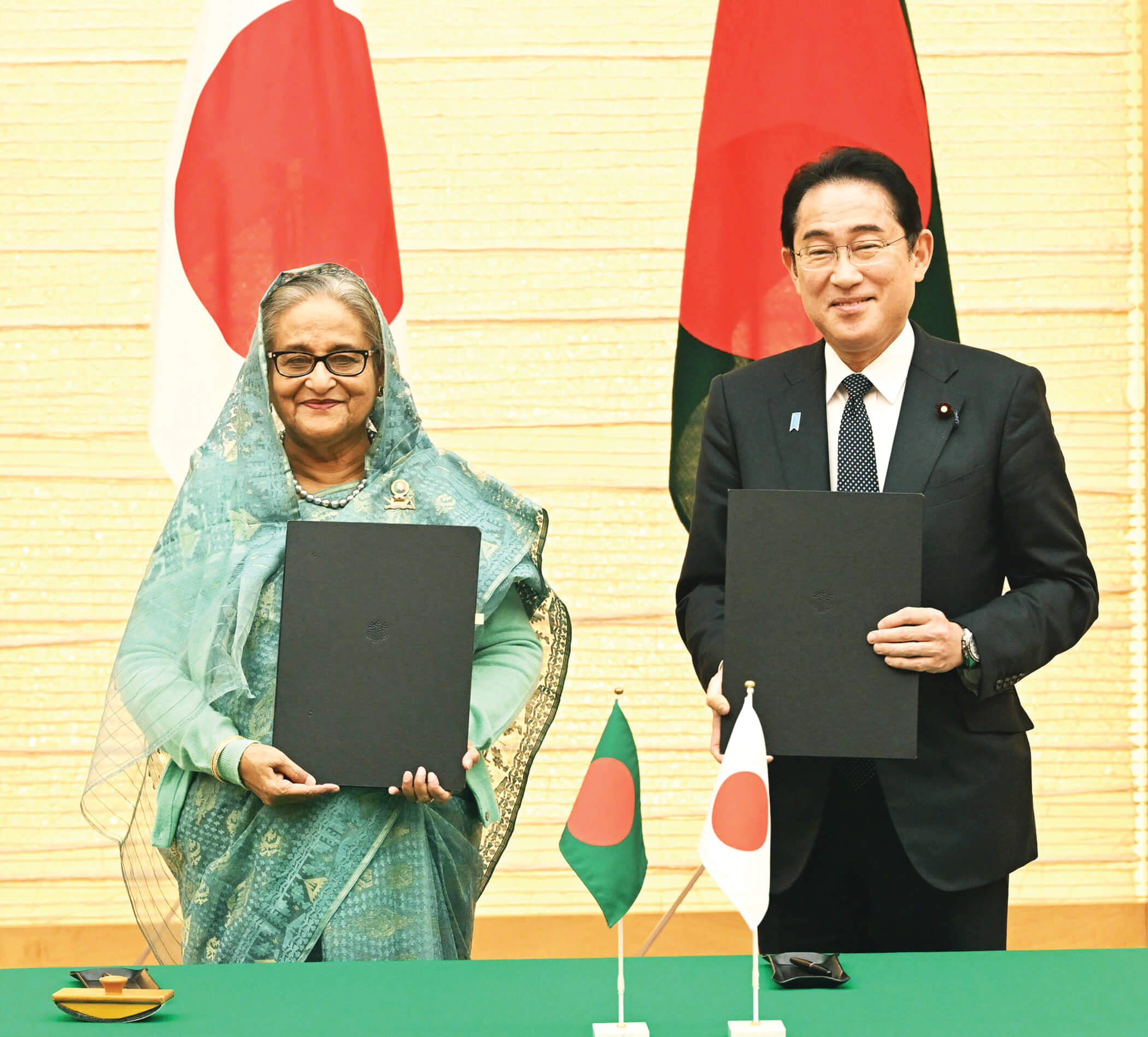প্রতিরক্ষা, কৃষি, তথ্যপ্রযুক্তিসহ বিভিন্ন ক্ষেত্রে সহযোগিতা বৃদ্ধির অঙ্গীকারে আটটি চুক্তি ও সমঝোতা স্মারক সই করেছে বাংলাদেশ ও জাপান। গতকাল বুধবার টোকিওতে জাপানের প্রধানমন্ত্রীর কার্যালয়ে দুই দেশের সরকারপ্রধানের উপস্থিতিতে এসব চুক্তি ও সমঝোতা স্মারক স্বাক্ষরিত হয়। তার আগে জাপানের প্রধানমন্ত্রী ফুমিও কিশিদা এবং বাংলাদেশের প্রধানমন্ত্রী শেখ হাসিনার নেতৃত্বে দুই দেশের প্রতিনিধিদলের মধ্যে দ্বিপক্ষীয় বৈঠক হয়। বৈঠকে উভয় পক্ষ মহেশখালী–মাতারবাড়ি সমন্বিত অবকাঠামো উন্নয়ন উদ্যোগ (এমআইডিআই) এবং বে অব বেঙ্গল ইন্ডাস্ট্রিয়াল গ্রোথ বেল্ট (বিগ–বি) অর্থনৈতিক অংশীদারিত্ব নিয়ে আলোচনা করেন। পরে প্রধানমন্ত্রীর কার্যালয়ে উভয় দেশের প্রধানমন্ত্রীদের উপস্থিতিতে বাংলাদেশ ও জাপানের মধ্যে চুক্তিগুলো বিনিময় করা হয় এবং দুই প্রধানমন্ত্রী যৌথ বিবৃতি প্রদান করেন। পরে বাংলাদেশের প্রধানমন্ত্রী শেখ হাসিনা গণমাধ্যমকে বলেন, প্রধানমন্ত্রী কিশিদা এবং আমি আমাদের দ্বিপাক্ষিক সম্পর্কের আদ্যপান্ত আলোচনা করেছি। আমরা খুব খুশী যে, আমরা বাংলাদেশ–জাপান বিদ্যমান দ্বিপাক্ষিক সম্পকর্কে ‘ব্যাপক অংশীদারিত্ব’ থেকে ‘কৌশলগত অংশীদারিত্বে পৌঁছাতে পেরেছি।