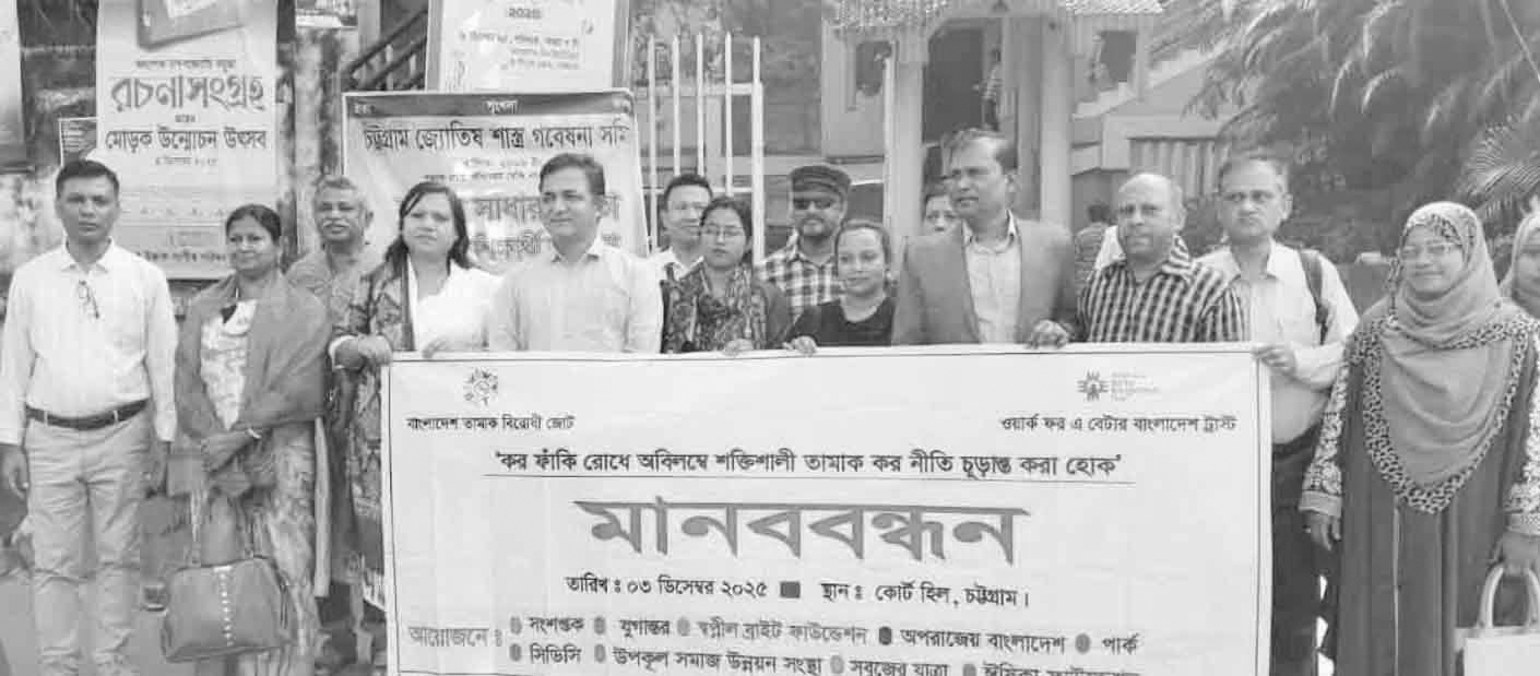 উপকূল সমাজ উন্নয়ন সংস্থার উদ্যোগে এবং বাংলাদেশ তামাক বিরোধী জোট ও ডাব্লিউবিবি ট্রাস্টের সহায়তায় একটি শক্তিশালী তামাক কর নীতিমালা প্রণয়ন ও বাস্তবায়নের দাবিতে মানববন্ধন অনুষ্ঠিত হয়। গত ৩ ডিসেম্বর কোর্টহিল চত্বরে অনুষ্ঠিত এ মানববন্ধনে উপস্থিত ছিলেন, সংশপ্তকের প্রধান নির্বাহী লিটন চৌধুরী, স্বপ্নিল ব্রাইট ফাউন্ডেশনের নির্বাহী পরিচালক মোহাম্মদ আলী শিকদার, পার্ক এর প্রধান নির্বাহী নজরুল ইসলাম মান্না, ঈষিকা ফাউন্ডেশনের প্রধান নির্বাহী জহুর ইসলাম, মমতার প্রোগ্রাম ম্যানেজার মুহিদ, অপারাজেয় বাংলাদেশের জিনাত আরা বেগম, ঊষা নারী উন্নয়ন সংস্থার প্রোগ্রাম ম্যানেজার পিযুষ দাশ গুপ্ত, কোডেকের অলকা চৌধুরী, ডাপার কাজী শাহ কামাল, সিডিসি, ইকো ফাউন্ডেশন এবং সবুজের যাত্রার প্রতিনিধিরা অংশগ্রহণ করেন। মানববন্ধন শেষে লিফলেট বিতরণ করা হয়। বক্তারা বলেন, বাংলাদেশে তামাক সেবনের হার জনস্বাস্থ্য উন্নয়নের পথে বড় বাধা। অসংখ্য মানুষ তামাকজনিত রোগে দীর্ঘস্থায়ী অসুস্থতায় ভুগছে। তামাক স্বাস্থ্যের ক্ষতির পাশাপাশি পরিবেশ ও সামষ্টিক অর্থনীতিতে প্রভাব ফেলছে। তামাকের এ অপব্যবহার প্রতিরোধে কার্যকর উপায়ে করারোপ, বিদ্যমান তামাকনিয়ন্ত্রন আইন যুগোপযোগীকরণ এবং একটি শক্তিশালী ও স্থায়িত্বশীল তামাক কর নীতি প্রয়োজন। কর এবং মূল্য বৃদ্ধি তামাকজাত দ্রব্যের ব্যবহার হ্রাসে গুরুত্বপূর্ণ ভূমিকা পালন করে। বিশেষ করে কিশোর ও নিম্ন আয়ের জনগোষ্ঠির মাঝে তামাক ব্যবহার হ্রাসে দৃশ্যমান প্রভাব ফেলে। এতে করে নতুন প্রজন্ম তামাকে আসক্ত হবার ঝুঁকি হ্রাস, রাজস্ব আয় বাড়বে এবং চিকিৎসা খাতে সরকারের ব্যয় হ্রাস পাবে। বিদ্যমান আইন ও ত্রুটিযুক্ত কর আদায় পদ্ধতির ফাঁক ফোকর দিয়ে তামাক কোম্পানীগুলো ব্যাপক পরিমাণ কর ফাঁকি দিচ্ছে, ফলে রাষ্ট্র বিপুল রাজস্ব বঞ্চিত হচ্ছে। তামাক কোম্পানীগুলোর এ ধরনের অপকৌশলের মাধ্যমে জনগণ ও সরকারের ক্ষতি প্রতিরোধে মানববন্ধন থেকে বিদ্যমান তামাকনিয়ন্ত্রন আইন শক্তিশালীকরণ এবং একটি স্থায়িত্বশীল তামাক কর নীতি প্রণয়নের প্রতি জোর দাবি জানানো হয়। প্রেস বিজ্ঞপ্তি।