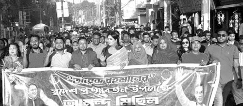 খাগড়াছড়িতে যুবদল–ছাত্রদলের আনন্দ মিছিল: প্রতিনিধি জানান, তারেক রহমানের স্বদেশ প্রত্যাবর্তন উপলক্ষে খাগড়াছড়িতে যুবদল ও ছাত্রদল আনন্দ মিছিল করেছে। সোমবার বিকেলে জেলা যুবদল ও জেলা ছাত্রদলের উদ্যোগে আদালত সড়ক থেকে একটি মিছিল বের হয়ে শহরের প্রধান সড়ক ঘরে আবার আদালত সড়কে সমাবেশ করে। সমাবেশে প্রধান অতিথি ছিলেন খাগড়াছড়ি জেলা বিএনপির প্রধান উপদেষ্টা জাকিয়া জিনাত বিথী। এ সময় উপস্থিত ছিলেন জেলা বিএনপির সাংগঠনিক সম্পাদক আব্দুর রব রাজা, জেলা যুবদলের সভাপতি মাহবুব আলম সবুজ, জেলা মহিলা দলের সভাপতি কুহেলী দেওয়ান, সাংগঠনিক সম্পাদক তাহমিনা সিরাজ সীমা, জেলা যুবদলের সহ–সভাপতি নাসির সিকদার, জেলা ছাত্রদল সভাপতি মো. আরিফ জাহিদ ও সাধারণ সম্পাদক সোহেল দেওয়ানসহ অন্যান্য নেতৃবৃন্দ। সমাবেশে বক্তারা বলেন, তারেক রহমানের স্বদেশ প্রত্যাবর্তনের মধ্য দিয়ে দেশে গণতন্ত্রের উত্তরণ হবে।