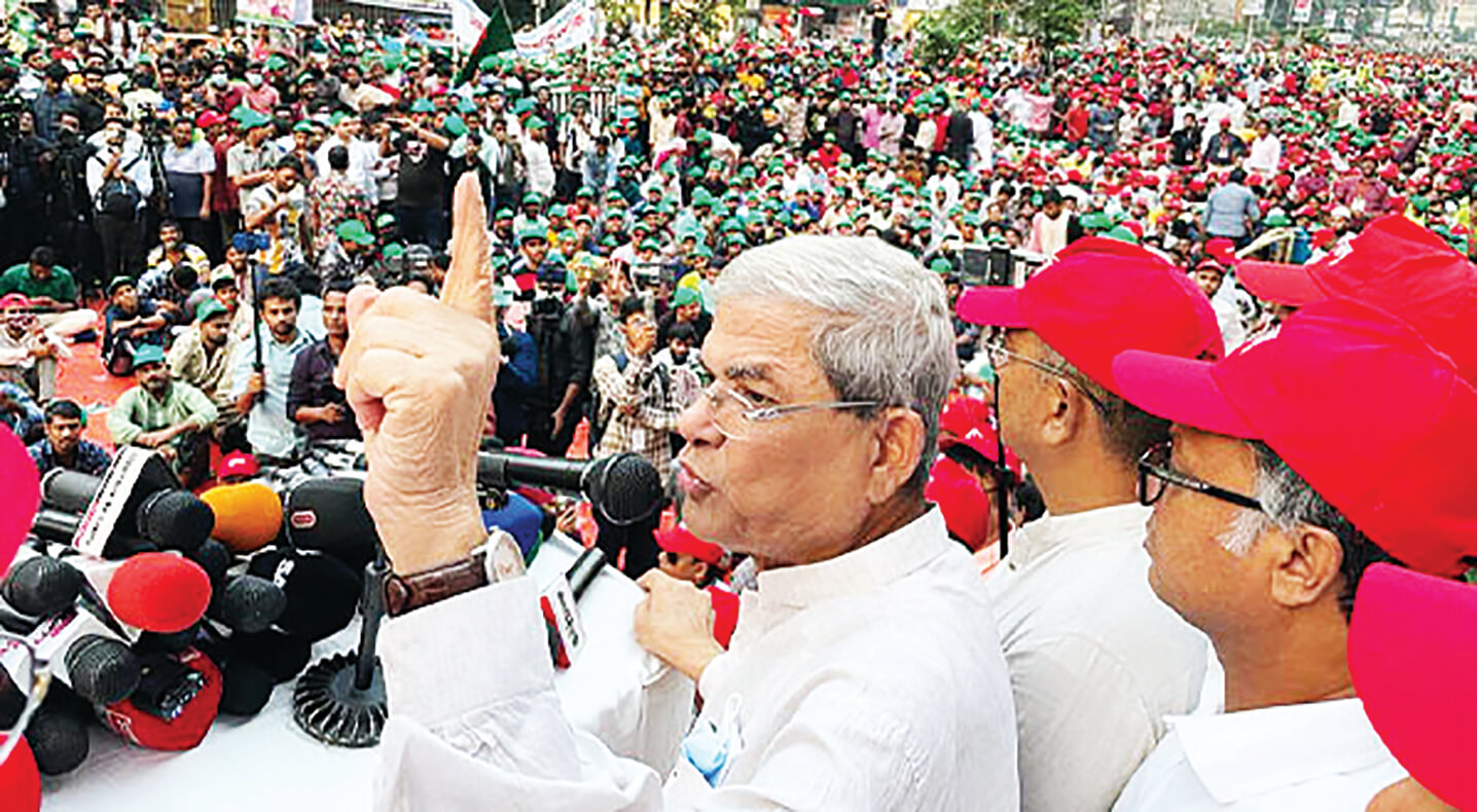 মির্জা ফখরুল আরও বলেন, চট্টগ্রাম, মযমনসিংহ ও খুলনায় ধর্মঘট ডেকেছে, সেই ধর্মঘট দিয়ে কি গণতন্ত্রকামী মানুষকে আটকে রাখতে পেরেছে? পারেনি। জনগণ তাদের দাবি জানাতে পায়ে হেঁটে বিভিন্নভাবে সমাবেশে এসে উপস্থিত হয়েছে। বরিশালে ধর্মঘট দিয়েছে, রংপুরে ধর্মঘট দিয়েছে কেন? যাতে জনসমাবেশ বন্ধ করা যায়। মুন্সীগঞ্জে ও নারাযণগঞ্জে যুবদল নেতাদের নিহত হওয়ার ঘটনার প্রসঙ্গ টেনে বিএনপির মহাসচিব বলেন, শেখ হাসিনার অবৈধ সরকার আজকে গুলি করে দমন করতে চায়। তারা আজকে অত্যাচার করে, নির্যাতন করে দমন করতে চায়। দেশে নির্বাচন নেই, নির্বাচন ব্যবস্থাকে আওয়ামী লীগ ধ্বংস করে দিয়েছে দাবি করে মির্জা ফখরুল বলেন, নির্বাচন কমিশন করেছে, যাকে ডিসি-এসপি মানে না এবং তারা নির্বাচন করতে পারে না। সুতরাং নির্বাচনের প্রশ্নই উঠতে পারে না। আমরা খুব পরিষ্কারভাবে বলেছি, হাসিনার অধীনে কোনো নির্বাচন হতে পারে না। নির্বাচনের পূর্বে হাসিনাকে পদত্যাগ করতে হবে, তার সরকারকে পদত্যাগ করতে হবে, সংসদ বিলুপ্ত করতে হবে এবং একটি তত্ত্বাবধায়ক সরকারের হাতে ক্ষমতা হস্তান্তর করতে হবে।