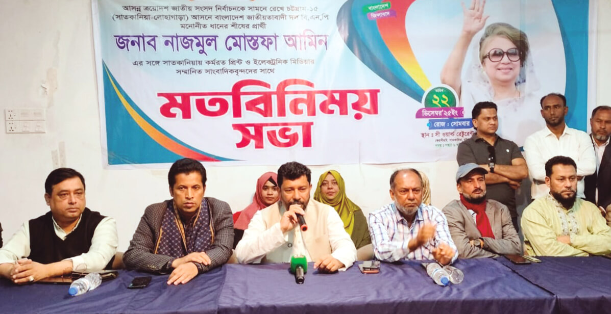 সংসদ নির্বাচনের আগেই থানা থেকে লুন্ঠিত ও অবৈধ অস্ত্র উদ্ধার না হলে চট্টগ্রাম–১৫ (সাতকানিয়া–লোহাগাড়া) আসনে সুষ্ঠু নির্বাচন সম্ভব নয় বলে মন্তব্য করেছেন এ আসন থেকে বাংলাদেশ জাতীয়তাবাদী দল (বিএনপি) মনোনীত সংসদ সদস্য পদপ্রার্থী নাজমুল মোস্তফা আমিন। তিনি বলেন, ৫ আগস্টের পর সাতকানিয়ায় ডাবল মার্ডার হয়েছে, প্রকৃত দোষীরা এখনও অধরা। হত্যাকাণ্ডে ব্যবহৃত হয়েছে লুন্ঠিত ও অবৈধ অস্ত্র। প্রায় দিন বিভিন্ন অজুহাতে আক্রান্ত হচ্ছে রাজনৈতিক দলের নেতা–কর্মী ও সাধারণ মানুষ। যে কোন ধরনের অপরাধমূলক কর্মকাণ্ডের প্রতিবাদ করলেই মানুষকে শিকার হতে হচ্ছে নানা ধরনের অত্যাচার নির্যাতনের। যার ফলে সাধারণ ভোটাররা শঙ্কিত। নিশ্চিন্তে ভোট দিতে কেন্দ্রে যেতে পারবে কিনা সন্দিহান ভোটাররা। তাই নির্বাচনকে অবাধ, সুষ্ঠু, ও নিরপেক্ষ করতে অবৈধ অস্ত্র উদ্ধারের বিকল্প নাই। নাজমুল মোস্তফা আমিন ২২ ডিসেম্বর সন্ধ্যা সাড়ে ৭টার দিকে চট্টগ্রামের সাতকানিয়ায় কর্মরত বিভিন্ন প্রিন্ট ও ইলেকট্রনিঙ মিডিয়ায় কর্মরত সাংবাদিকদের সাথে মতবিনিময়কালে এসব কথা বলেন। মতবিনিময় সভায় উপস্থিত ছিলেন চট্টগ্রাম দক্ষিণ জেলা বিএনপির সাবেক সাধারণ সম্পাদক ও বর্তমান আহ্বায়ক কমিটির ১ নম্বর সদস্য অধ্যাপক শেখ মো. মহিউদ্দিন। এসময় বিএনপি ও অঙ্গ সংগঠনের জেলা ও উপজেলার বিভিন্ন পর্যায়ের অন্যান্য নেতৃবৃন্দের মধ্যে উপস্থিত ছিলেন, জসিম উদ্দিন আবদুল্লাহ, জান্নাতুল নাঈম রিকু, এডভোকেট এরশাদুর রহমান রিটু, নুরুল কবির বাদশা, হাজী আহমদ কবির, এডভোকেট দেলোয়ার হোসাইন, এডভোকেট হাফিজুল ইসলাম মানিক, শাহাব উদ্দিন রাশেদ, হাসান আলী, সাজেদুল আলম মিঠু, হাজী আবু তালেব, মো.শফি সও., মো. ইব্রাহিম মেম্বার, মোদাচ্ছির আলম, জুনাইদুল হক চৌধুরী ও মো.আরিফ প্রমুখ। প্রেস বিজ্ঞপ্তি।