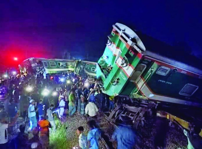 কুমিল্লায় মালবাহী ট্রেনকে ধাক্কা দিয়ে উল্টে গেল সোনার বাংলা এক্সপ্রেসের বেশ কয়েকটি বগি। গতকাল রোববার সন্ধ্যায় ইফতারের পরপরই নাঙ্গলকোটের হাসানপুর স্টেশনে এই দুর্ঘটনা ঘটে বলে প্রত্যক্ষদর্শী ও রেল কর্মকর্তারা জানিয়েছেন। এই দুর্ঘটনায় অর্ধশতের মতো আহত হওয়ার খবর রেল কর্মকর্তা ও পুলিশের কাছ থেকে পাওয়া গেছে। সোনার বাংলা এক্সপ্রেসে নির্বাচন কমিশনের ১২ জন কর্মকর্তা থাকলেও তারা অক্ষত রয়েছেন। দুর্ঘটনার কারণে প্রায় আড়াই ঘণ্টা ঢাকা ও সিলেট থেকে চট্টগ্রাম, নোয়াখালী ও চাঁদপুরের ট্রেন চলাচল বন্ধ ছিল। দুর্ঘটনার কারণ অনুসন্ধানে একটি কমিটি করেছে রেলওয়ে। কমিটিকে তিন দিনের মধ্যে প্রতিবেদন দিতে বলা হয়েছে। দেশের দ্রুতগামী ট্রেনের একটি সোনার বাংলা এক্সপ্রেস চট্টগ্রাম থেকে ঢাকা যাচ্ছিল। পথে কুমিল্লা শহরের আগে নাঙ্গলকোট উপজেলার হাসানপুর রেল স্টেশন। সেই স্টেশনে গতকাল সন্ধ্যা পৌনে ৭টার দিকে এই দুর্ঘটনা ঘটে বলে পূর্ব রেলের ডিভিশনাল ট্রাফিক অফিসার তারেক মো. ইমরান জানিয়েছেন। ঘটনার পরপরই তিনি বলেন, কুমিল্লার হাসানপুর স্টেশনে দুর্ঘটনায় সোনার বাংলা এক্সপ্রেসের পাঁচটি বগি লাইনচ্যুত হয়েছে। এতে অনেকে আহত হয়েছেন বলে খবর পেলেও কারও নিহত হওয়ার খবর পাননি বলে জানান তিনি। খবর বিডিনিউজের।