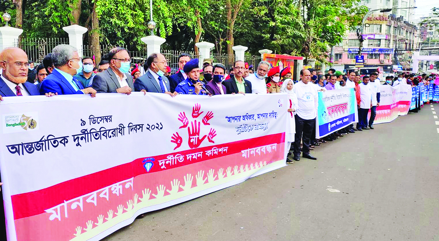 রাঙ্গুনিয়ায় মানববন্ধন ও র্যালি : রাঙ্গুনিয়া প্রতিনিধি জানান, ‘আপনার অধিকার, আমার দায়িত্ব : দুর্নীতিকে না বলুন’ এই শ্লোগানে আন্তর্জাতিক দুর্নীতিবিরোধী দিবস উপলক্ষে রাঙ্গুনিয়া উপজেলা দুর্নীতি প্রতিরোধ কমিটির আয়োজনে মানববন্ধন, র্যালি ও আলোচনা সভা অনুষ্ঠিত হয়েছে। গতকাল বৃহস্পতিবার সকালে উপজেলা সদরের ইছাখালী এলাকায় অনুষ্ঠিত মানববন্ধনে অংশ নিয়েছেন বিভিন্ন শ্রেণি পেশার মানুষ ও শিক্ষার্থীবৃন্দ। র্যালি শেষে আলোচনা সভা অনুষ্ঠিত হয়। কর্মসূচিতে প্রধান অতিথি ছিলেন উপজেলা নির্বাহী অফিসার ইফতেখার ইউনুস। উপজেলা দুর্নীতি প্রতিরোধ কমিটির সভাপতি নির্মল কান্তি দাশের সভাপতিত্বে ও সাধারণ সম্পাদক আবদুল মাবুদের সঞ্চালনায় বিশেষ অতিথি ছিলেন উপজেলা সমাজসেবা কর্মকর্তা মুহাম্মদ হাসান, মো. সামশুদ্দিন, জিগারুল ইসলাম জিগার, মাসুদ নাসির, জগলুল হুদা, বাবলা তালুকদার প্রমুখ।