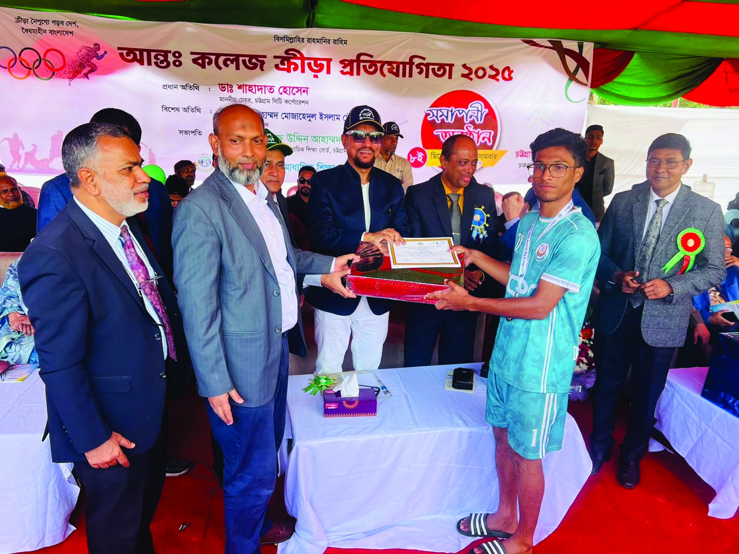 চট্টগ্রাম মাধ্যমিক ও উচ্চ মাধ্যমিক শিক্ষা বোর্ড আয়োজিত আন্তঃকলেজ ক্রীড়া প্রতিযোগিতা ২০২৫ গতকাল সোমবার সম্পন্ন হয়েছে। চট্টগ্রাম কলেজ মাঠে অনুষ্ঠিত এ প্রতিযোগিতায় মাধ্যমিক ও উচ্চ মাধ্যমিক শিক্ষা বোর্ড চট্টগ্রাম অধিভুক্ত একাদশ ও দ্বাদশ শ্রেণীতে অধ্যয়নরত নিয়মিত ছাত্র–ছাত্রীরা অংশ নেয়। মহানগর পূর্ব, মহানগর পশ্চিম, চট্টগ্রাম দক্ষিণ, চট্টগ্রাম উত্তর, রাঙ্গামাটি, খাগড়াছড়ি, বান্দরবান ও কক্সবাজার জেলার বাছাইকৃত ৮ অঞ্চলের ১৩০ জন প্রতিযোগি মোট ৯টি ইভেন্টে অংশগ্রহণ করে। প্রতিযোগিতার অন্যতম আকর্ষণ ছিল ১০০ মিটার দৌড়। ছাত্রদের এই ইভেন্টে প্রথম হয়েছেন কুতুবদিয়া কলেজের মনির উদ্দিন। ছাত্রীদের ১০০ মিটার দৌড়ে প্রথম হয়েছেন খাগড়াছড়ি সরকারি কলেজের কুশলী দেওয়ান। সব ইভেন্ট শেষে বিকেলে প্রধান অতিথি হিসেবে পুরস্কার বিতরণ করেন চট্টগ্রাম সিটি কর্পোরেশনের মেয়র ডা. শাহাদাত হোসেন। চট্টগ্রাম মাধ্যমিক ও উচ্চ মাধ্যমিক শিক্ষা বোর্ডের চেয়ারম্যান প্রফেসর ইলিয়াছ উদ্দিন আহাম্মদের সভাপতিত্বে অনুষ্ঠিত সমাপনী অনুষ্ঠানে বিশেষ অতিথি হিসাবে উপস্থিত ছিলেন চট্টগ্রাম কলেজের অধ্যক্ষ অধ্যাপক মোহাম্মদ মোজাহেদুল ইসলাম চৌধুরী, চট্টগ্রাম শিক্ষা বোর্ডের সাবেক চেয়ারম্যান আবু জাফর চৌধুরী ও সাবেক চেয়ারম্যান রেজাউল করিম চৌধুরী, সরকারি মহসিন কলেজের অধ্যক্ষ প্রফেসর বেনু আরা বেগম ও উপাধ্যক্ষ প্রফেসর সারাহ পারীন, সরকারি সিটি কলেজের অধ্যক্ষ প্রফেসর আবু সালেহ মো. নঈমুদ্দিন ও উপাধ্যক্ষ প্রফেসর মো. জসিম উদ্দিন, সরকারি মহিলা কলেজের অধ্যক্ষ প্রফেসর রেজা খান হেলালী ও উপাধ্যক্ষ প্রফেসর আবদুল্লা আল মামুন চৌধুরী, খাগড়াছড়ি সরকারি কলেজের অধ্যক্ষ প্রফেসর শরাফত হোসেন, পটিয়ার সরকারি কলেজের প্রাক্তন অধ্যক্ষ প্রফেসর মো. মোজাম্মেল হক। এর আগে সকাল ৯টায় আন্তঃ কলেজ ক্রীড়া প্রতিযোগিতা ২০২৫ এর উদ্বোধন করেন চট্টগ্রাম বিভাগীয় কমিশনার ড. মো. জিয়াউদ্দিন। চট্টগ্রাম শিক্ষা বোর্ডের চেয়ারম্যান অধ্যাপক ইলিয়াস উদ্দিন আহাম্মদের সভাপতিত্বে এসময় বিশেষ অতিথি ছিলেন চট্টগ্রাম শিক্ষা বোর্ডের সচিব প্রফেসর ড. এ কে এম সামছু উদ্দিন আজাদ। স্বাগত বক্তব্য রাখেন চট্টগ্রাম শিক্ষা বোর্ডের কলেজ পরিদর্শক প্রফেসর ড. মোহাম্মদ ছরওয়ার আলম। জাতীয় সঙ্গীত পরিবেশনের মাধ্যমে শুরু হওয়া অনুষ্ঠানে ডিসপ্লে প্রদর্শনী করে সিলভার বেলস স্কুলের ছাত্রীরা।