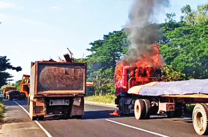 রাঙ্গুনিয়ায়ও গাড়িতে আগুন : রাঙ্গুনিয়া প্রতিনিধি জানান, বুধবার ভোররাত ৪টার দিকে চট্টগ্রাম–কাপ্তাই সড়কের রাঙ্গুনিয়া উপজেলার চন্দ্রঘোনা–কদমতলী ইউনিয়নের হাবিবের গোট্টা সড়কের গাছ কেটে রাস্তায় ফেলে ব্যারিকেড দেয় দুর্বৃত্তরা। এতে আটকে যাওয়া দুটির পাথর বোঝাই ট্রাকে (খুলনা মেট্রো–শ–১১–০৩৪৭ এবং ঢাকা মেট্রো–ট–১২–০৮৯৫) আগুন ধরিয়ে দেয়। খবর পেয়ে পুলিশ ও ফায়ার সার্ভিসের কর্মীরা গিয়ে আগুন নেভানোর পর সড়কের গাছ সরিয়ে নিয়ে যান চলাচল স্বাভাবিক করে। এর আগে মঙ্গলবার দিবাগত রাত ২টার দিকে এছাড়া উপজেলার পোমরা ইউনিয়নের সেলিমা কাদের কলেজ গেট এলাকায় একটা মোটরসাইকেল পুড়িয়ে দেয়া হয়।