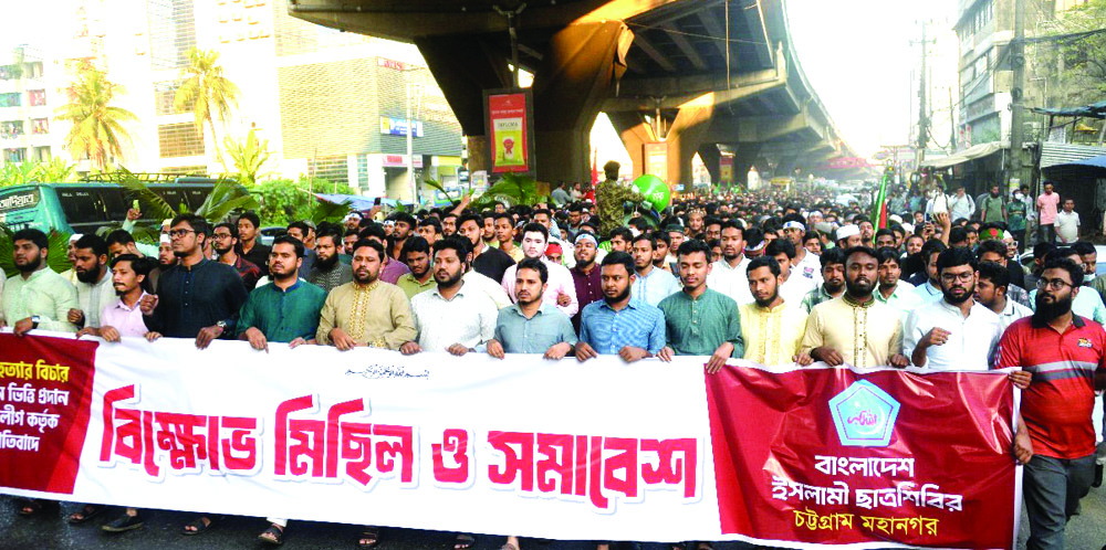 জুলাইসহ সকল ‘গণহত্যা’র বিচার, জুলাই সনদের আইনি ভিত্তি প্রদান ও আওয়ামী লীগ কর্তৃক ‘নাশকতা’ সৃষ্টির প্রতিবাদে নগরে বিক্ষোভ মিছিল ও সমাবেশ করেছে বাংলাদেশ ইসলামী ছাত্রশিবির। গতকাল বিকেলে মিছিলটি মুরাদপুর থেকে শুরু হয়ে ২নং গেইট এলাকায় পৌঁছে সমাবেশের মাধ্যমে শেষ হয়। সমাবেশে শিবিরের নেতৃবৃন্দ বলেন, বাংলাদেশের মাটিতে আর কোনো অবিচার ও দমননীতি সহ্য করা হবে না। জনগণের রক্তে রঞ্জিত এই মাটিতে গণহত্যাকারীদের বিচার হবেই। দেশের জনগণ ন্যায়বিচার ও স্বাধীনতার পক্ষে ঐক্যবদ্ধ। জুলাইসহ সকল গণহত্যার বিচার ও জুলাই সনদের বাস্তবায়ন এখন সময়ের দাবি। নিষিদ্ধ আওয়ামী লীগের নাশকতা ও দেশবিরোধী ষড়যন্ত্রের বিরুদ্ধে শিক্ষার্থীরা ঐক্যবদ্ধ প্রতিরোধ গড়ে তুলবে। বিক্ষোভ মিছিলে নেতৃত্ব দেন চাকসু ভিপি ইব্রাহীম হোসেন রনি, শিবিরের চট্টগ্রাম মহানগর উত্তর সভাপতি তানজির হোসেন জুয়েল, মহানগর দক্ষিণ সভাপতি মাইমুমুনুল ইসলাম মামুন, চট্টগ্রাম বিশ্ববিদ্যালয় সভাপতি মুহাম্মদ আলী।