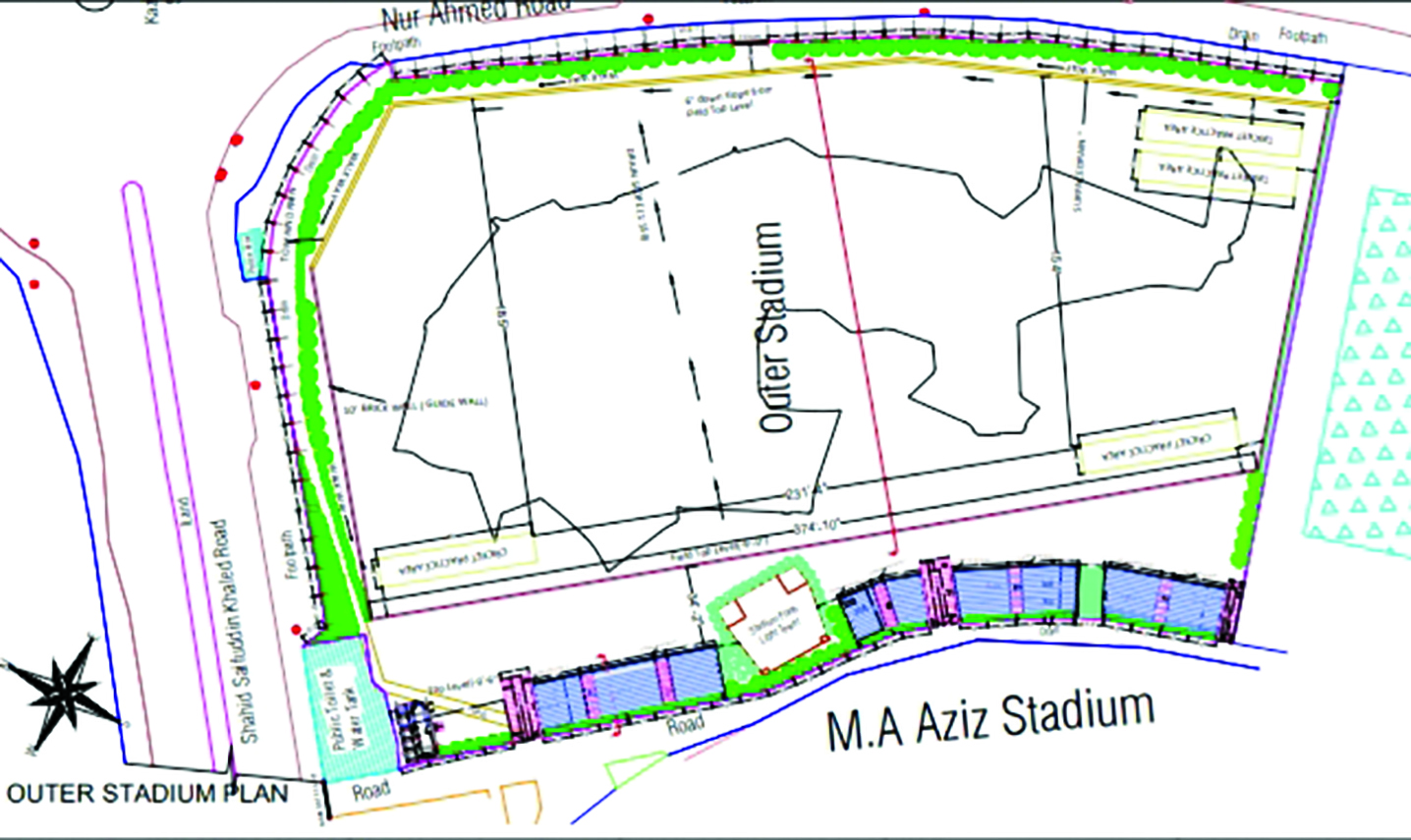 নতুন নকশায় আউটার স্টেডিয়ামের চারপাশে মানুষ বসার জায়গা রাখা হবে। মাঠের পশ্চিম পাশে নির্মাণ করা হবে গ্যালারি। যাতে প্রায় দুইশর বেশি মানুষ বসতে পারবে। সীমানা প্রাচীরের ভেতরে মাঠের চারদিকে থাকবে ওয়াকওয়ে। আউটার স্টেডিয়ামের যে পাশে এখন মুক্ত মঞ্চ স্থাপন করা হয়েছে সেখানেই হবে মাঠে ঢুকার মূল প্রবেশ পথ। আর সেখানেই তৈরি করা হবে ড্রেসিং রুম এবং মাঠের উত্তর পাশে করা হবে টয়লেট ব্লক। এছাড়া মাঠের চারপাশে সবুজ বেস্টনি তৈরি করতে লাগানো হবে গাছ। যাতে একটি প্রাকৃতিক পরিবেশ পাওয়া যায়। মাঠের উত্তর–পশ্চিম কোনায় মূল প্রবেশ পথ ছাড়াও মাঠের পূর্ব পাশে আরেকটি প্রবেশ পথ থাকবে। তবে সেটি ইমার্জেন্সি কাজে ব্যবহার করা হবে। সবমিলিয়ে নতুন ডিজাইনে আউটার স্টেডিয়াম হবে একটি দৃষ্টি নন্দন স্থাপনা।