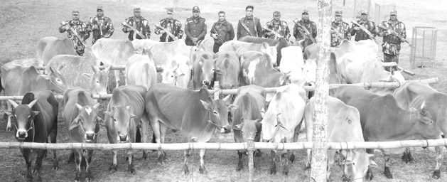 নাইক্ষ্যংছড়ি সীমান্ত থেকে ৫৮টি বার্মিজ গরু জব্দ করেছে ১১ বিজিবির সদস্যরা। গত শুক্রবার থেকে গতকাল সোমাবার পর্যন্ত সীমান্তের কয়েকটি পয়েন্টে অভিযান চালিয়ে এসব গরু জব্দ করা হয়। জব্দকৃত গরুর মূল্য ৬৯ লাখ ৬০ হাজার টাকা বলে জানা যায়। বিষয়টি নিশ্চিত করেছেন ১১ বিজিবি অধিনায়ক লে. কর্ণেল মো. রেজাউল করিম। তিনি বলেন, সীমান্ত পথে গরুসহ চোরাচালান রোধকল্পে নাইক্ষ্যংছড়ি ব্যাটালিয়ন (১১ বিজিবি) কঠোর নজরদারী ও গোয়েন্দা তৎপরতা বৃদ্ধি করেছে। এছাড়াও যেকোনো মূল্যে তারা সীমান্তে চোরাচালান প্রতিরোধে অগ্রণী ভূমিকা পালন করছে। বিশেষ করে মাননীয় প্রধানমন্ত্রীর মাদক ও চোরাচালানের বিরোধী জিরো ট্রলারেন্স নীতি বাস্তবায়নে নাইক্ষ্যংছড়ি ব্যাটালিয়ন (১১ বিজিবি) প্রতিশ্রুতিবদ্ধ।