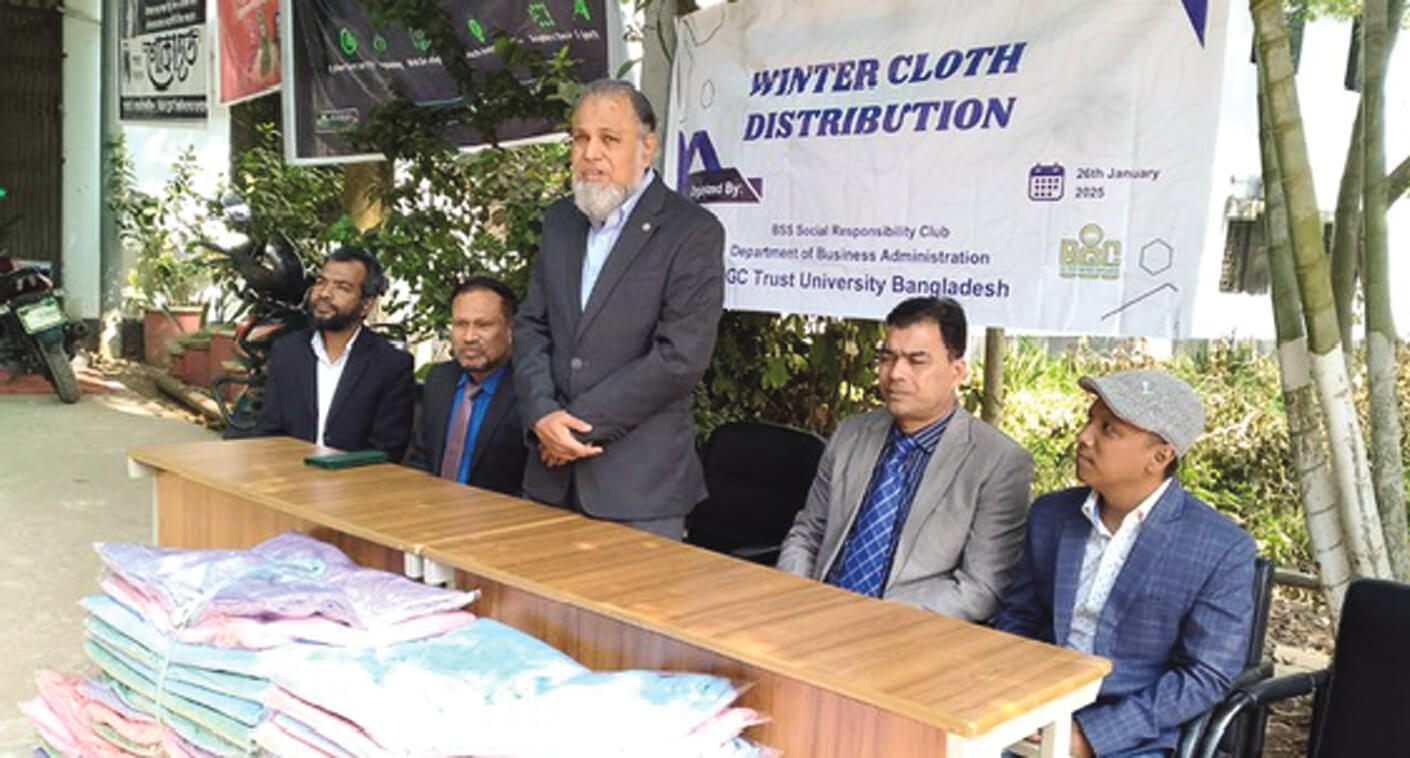 বিজিসি ট্রাস্ট ভার্সিটির ব্যবসায় প্রশাসন বিভাগের স্যোশাল রেসপনসিবিলিটি ক্লাবের উদ্যোগে শীতবস্ত্র বিতরণ ব্যবসায় প্রশাসন বিভাগের চেয়ারম্যান প্রফেসর ড.সরোয়ার উদ্দিনের সভাপতিত্বে অনুষ্ঠিত হয়। এতে প্রধান অতিথি ছিলেন উপাচার্য প্রফেসর ড. এ.এফ.এম. আওরঙ্গজেব। বিশেষ অতিথি ছিলেন রেজিস্ট্রার ইনচার্জ ড.এস.এম শোয়েভ। ক্লাবের উপদেষ্টা ব্যবসায় প্রশাসন বিভাগের সহকারী অধ্যাপক ধীমান বড়ুয়ার সঞ্চালনায় অনুষ্ঠানে উপস্থিত ছিলেন প্রক্টর ড. সিরাজ মিয়া, ক্লাব চীফ তাসমিউল হাসান আলিফ প্রমুখ।