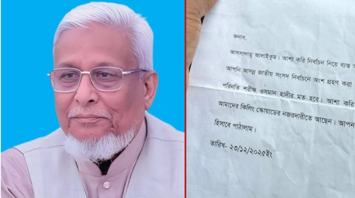 সাথে পাঠানো চিঠিতে তাঁকে নির্বাচন থেকে সরে দাঁড়াতে এই হুমকি দেয়া হয়েছে। চিঠিতে বলা হয়েছে, ‘নির্বাচন থেকে সরে না দাঁড়ালে আপনার পরিণতি ওসমান বিন হাদির মতো হবে।’
