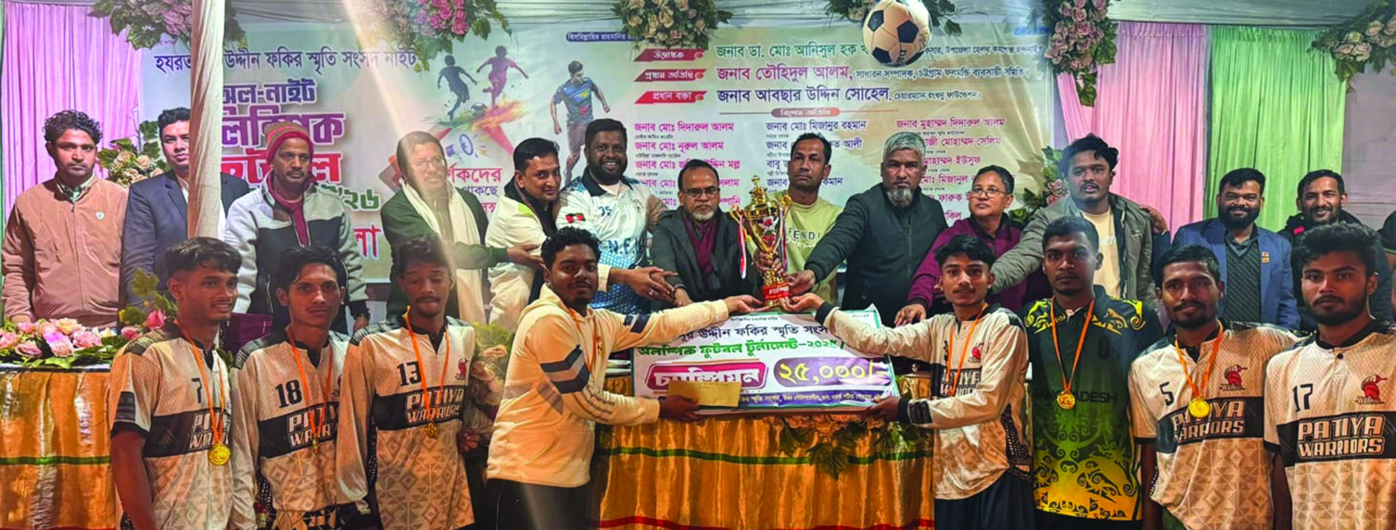 পটিয়া প্রতিনিধি : পটিয়ায় হযরত নুর উদ্দীন ফকির স্মৃতি অলিম্পিক অল নাইট ফুটবল টুর্নামেন্টের ফাইনালে কে এস স্পোর্টসকে ১–০ গোলে হারিয়ে চ্যাম্পিয়ন হয়েছে পটিয়া ওয়ারিয়র্স ফুটবল দল। রোববার রাতে পৌরসভার উত্তর গোবিন্দার খিল সরকারী প্রাথমিক বিদ্যালয় মাঠে খেলার প্রথমার্ধে পটিয়া ওয়ারিয়র্সের আক্রমণভাগের খেলোয়াড় রিবুর মাটি কামড়ানো শটে গোল করেন। খেলার বাকি সময় ও দ্বিতীয়ার্ধে গোল পরিশোধে মরিয়া হয়ে উঠলেও কে এস স্পোর্টস গোল পরিশোধে ব্যর্থ হয়। খেলা শেষে ম্যান অব দা টুর্নামেন্ট ও ম্যান অব দা ম্যাচের পুরস্কার লাভ করেন বিজয়ী দলের একমাত্র গোলদাতা রিবু। সেরা গোলরক্ষকের পুরস্কার লাভ করেন কে এস স্পোর্টসের বাবু, সর্বোচ্চ গোলদাতার পুরস্কার লাভ করেন ফইল্যাতলী স্পোর্টসের তুষার। খেলা শেষে চ্যাম্পিয়ন ও রানার্স আপ দলের খেলোয়াড়দের মাঝে পুরস্কার তুলে দেন অনুষ্ঠানে উপস্থিত অতিথিবৃন্দ। ফাইনাল খেলার পুরস্কার বিতরণী অনুষ্ঠান হযরত নুর উদ্দীন ফকির স্মৃতি সংসদের সভাপতি মোহাম্মদ জুয়েলের সভাপতিত্বে ফাইনাল খেলার উদ্বোধন করেন চন্দনাইশ উপজেলা হেলথ কমপ্লেক্সের মেডিকেল অফিসার ডা. মো: আনিসুল হক খাঁন, প্রধান অতিথি ছিলেন চট্টগ্রাম ফলমন্ডি ব্যবসায়ী সমিতির সাধারণ সম্পাদক তৌহিদুল আলম, বক্তব্য রাখেন রংধনু ফাউন্ডেশনের চেয়ারম্যান আবছার উদ্দিন সোহেল। অনুষ্ঠানে বিশেষ অতিথি ছিলেন মো. দিদারুল আলম, মো. জসিম উদ্দিন মল্ল, সাংবাদিক শফিউল আজম, মো. মিজানুর রহমান, লিয়াকত আলী, ডা. সঞ্জয়, মো. লোকমান, বিকাশ ধর, মো. নুরুল ইসলাম প্রমুখ।