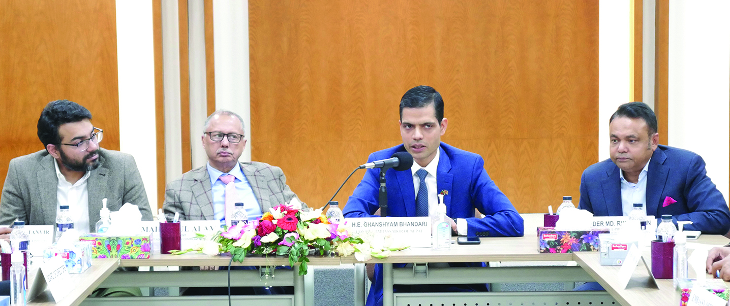 বাংলাদেশে নিযুক্ত নেপালের রাষ্ট্রদূত ঘনশ্যাম ভাণ্ডারী গতকাল রোববার ওয়ার্ল্ড ট্রেড সেন্টারে চিটাগাং চেম্বার পরিচালকমন্ডলীর সাথে এক মতবিনিময় সভায় মিলিত হন। চেম্বার সভাপতি মাহবুবুল আলমের সভাপতিত্বে এতে সিনিয়র সহ–সভাপতি তরফদার মো. রুহুল আমিন ও সহ–সভাপতি সৈয়দ মোহাম্মদ তানভীর বক্তব্য রাখেন। এ সময় চেম্বার পরিচালকবৃন্দ এ. কে. এম. আকতার হোসেন, জহিরুল ইসলাম চৌধুরী (আলমগীর), অঞ্জন শেখর দাশ, মো. ওমর ফারুক, শাহজাদা মো. ফৌজুল আলেফ খান, ইঞ্জিনিয়ার ইফতেখার হোসেন, মো. ইফতেখার ফয়সাল, এস. এম. তাহসিন জোনায়েদ, দূতাবাসের থার্ড সেক্রেটারী সুভাষ মাগার উপস্থিত ছিলেন।