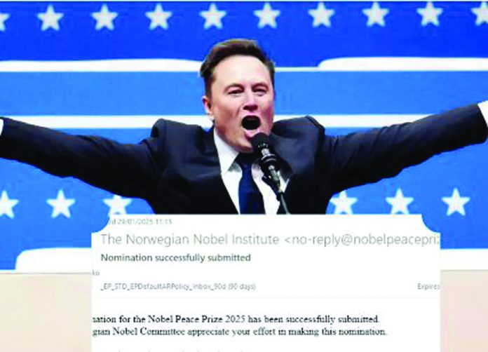 বাকস্বাধীনতা বিস্তারে গুরুত্বপূর্ণ ভূমিকা রাখায় নোবেল শান্তি পুরস্কারের জন্য মনোনয়ন পেয়েছেন বিশ্বের শীর্ষ ধনী এবং যুক্তরাষ্ট্রের বর্তমান প্রেসিডেন্ট ডোনাল্ড ট্রাম্পের নেতৃত্বাধীন প্রশাসনের মন্ত্রী ইলন মাস্ক। নোবেল কমিটি ইতোমধ্যে এ তথ্য নিশ্চিত করে মাস্ককে ইমেইলও প্রদান করেছে। স্লোভেনিয়ার রাজনীতিবিদ এবং ইউরোপের দেশগুলোর জোট ইউরোপীয় ইউনিয়নের (ইউ) পার্লামেন্ট সদস্য ব্র্যাঙ্কো গ্রিমস বৃহস্পতিবার সামাজিক যোগাযোগ মাধ্যম এক্সে পোস্ট করা এক বার্তায় এ তথ্য জানিয়েছেন তিনি। বার্তায় নোবেল কমিটির ইমেইলও সংযুক্ত করেছেন গ্রিমস।