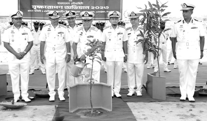দেশব্যাপী ‘জাতীয় বৃক্ষরোপণ অভিযান২০২৩’ বাস্তবায়নের অংশ হিসেবে বাংলাদেশ নৌবাহিনীতে বৃক্ষরোপণ কর্মসূচি পালিত হচ্ছে। গতকাল সোমবার নৌবাহিনী প্রধান এডমিরাল এম শাহীন ইকবাল কক্সবাজারের পেকুয়ায় বানৌজা শেখ হাসিনা ঘাঁটিতে সাবমেরিন ফ্লিট হেডকোয়ার্টার্সের সম্মুখে একটি গাছের চারা রোপণের মাধ্যমে এ কর্মসূচির উদ্বোধন করেন। এ সময় চট্টগ্রাম নৌঅঞ্চলের আঞ্চলিক কমান্ডার, ঊর্ধ্বতন সামরিক ও অসামরিক কর্মকর্তা, কর্মচারী এবং নাবিকবৃন্দ উপস্থিত ছিলেন। এদিন ঢাকা, চট্টগ্রাম, খুলনা, মোংলা ও কাপ্তাইসহ সকল নৌ ঘাঁটিতে একযোগে এ কর্মসূচির উদ্বোধন করা হয়।বৃক্ষরোপণ কর্মসূচি উদ্বোধনের পর নৌবাহিনী প্রধান বর্তমান সরকার গৃহীত কার্যক্রমসমূহ যথাযথভাবে বাস্তবায়নে সর্বস্তরের নৌসদস্যদের এগিয়ে আসার আহ্বান জানান। এছাড়া তিনি উপকূলীয় অঞ্চলে অধিকহারে বৃক্ষরোপণের মাধ্যমে প্রাকৃতিক দুর্যোগ মোকাবেলা ও পরিবেশের ভারসাম্য রক্ষার উপর গুরুত্বারোপ করেন। এই কর্মসূচি পালনের অংশ হিসেবে মাসব্যাপী বিভিন্ন নৌ ঘাঁটি, উপকূলীয় স্থাপনা এবং এলাকাসমূহে বিভিন্ন ফলজ, বনজ ও ভেষজ চারা রোপণের মাধ্যমে বৃক্ষরোপণ কর্মসূচি পালন করবে বাংলাদেশ নৌবাহিনী। প্রেস বিজ্ঞপ্তি।