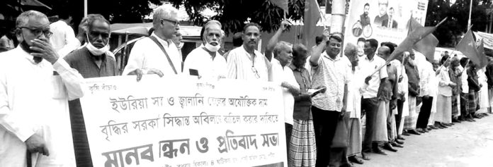 ইউরিয়া সার, জ্বালানি তেলের মূল্য বৃদ্ধির সরকারি সিদ্ধান্ত বাতিলের দাবি ও নিত্য প্রয়োজনীয় দ্রব্য মূল্যবৃদ্ধির প্রতিবাদে কৃষক সমিতি দক্ষিণ জেলার উদ্যোগে গত বুধবার পটিয়ায় কৃষক সমাবেশ, মানবন্ধন অনুষ্ঠিত হয়েছে। শেষে এক বিক্ষোভ মিছিল পটিয়ার বিভিন্ন সড়ক প্রদক্ষিণ করে। দক্ষিণ জেলা কৃষক সমিতির সভাপতি আবদুল নবীর সভাপতিত্বে পটিয়া পোষ্ট অফিস মোড়ে অনুষ্ঠিত সমাবেশে প্রধান অতিথি ছিলেন কৃষক সমিতি কেন্দ্রিয় কমিটির সহ সভাপতি পুলক দাশ। প্রধান বক্তা ছিলেন সিপিবি দক্ষিণ জেলার সভাপতি অধ্যাপক কানাই দাশ। অনুপম বড়ুয়ার সঞ্চালনায় সমাবেশে বক্তব্য রাখেন নজরুল ইসলাম আজাদ, স্বপন দত্ত, শওকত আলী, সনত বড়ুয়া প্রমুখ। বক্তারা বলেন, কৃষিকে কেন্দ্র করে দেশের ৮০ শতাংশ মানুষ আজ প্রত্যক্ষ ও পরোক্ষভাবে জড়িত। অথচ কৃষি খাত এখনও অবহেলা ও অবজ্ঞার শিকার। এদিকে কৃষক ও কৃষির নানা সংকটের মধ্যে সরকার ইউরিয়া সার ও তেলের দাম অস্বাভাবিক ভাবে বাড়িয়ে কৃষকদেরকে গভীর সংকটে ফেলে দিয়েছে। বক্তারা বলেন,কৃষক ও কৃষিকে বাঁচাতে সরকারের এই গণবিরোধী নীতির বিরুদ্ধে আন্দোলন গড়ে তুলতে হবে।