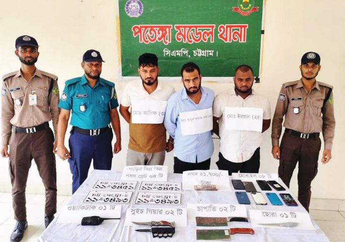 নগরীর পতেঙ্গায় ডাকাতদলের ৩ সদস্যকে গ্রেপ্তার করেছে পুলিশ। তারা হলেন আবুল কালাম স্বপন, মো. আরিফ ও মো. ইমরান। গত মঙ্গলবার পতেঙ্গার খেজুরতলার মাদ্রাসা গলি এলাকা থেকে তাদের গ্রেপ্তার করা হয়।