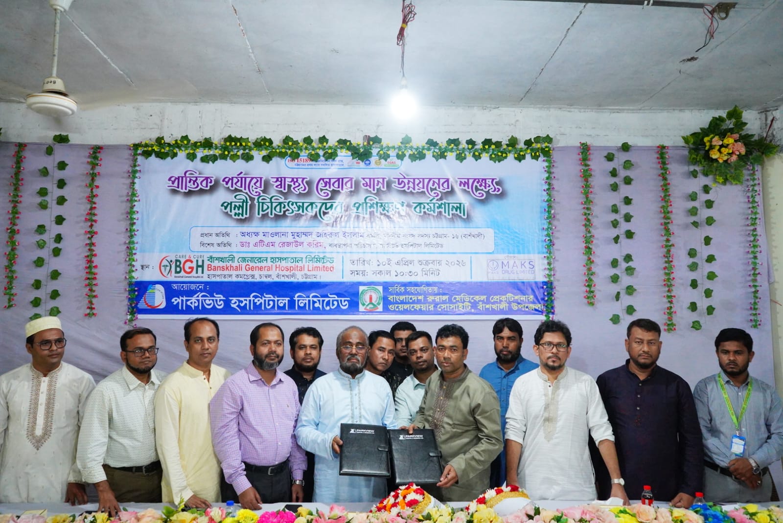 চট্টগ্রাম: প্রাথমিক পর্যায়ে স্বাস্থ্যসেবার মান উন্নয়নের লক্ষ্যে আয়োজিত পল্লী চিকিৎসকদের একটি প্রশিক্ষণ কর্মশালা সফলভাবে সম্পন্ন হয়েছে। পার্কভিউ হাসপাতাল লিমিটেডের উদ্যোগে এবং বাংলাদেশ রুরাল মেডিকেল প্র্যাকটিশনার ওয়েলফেয়ার সোসাইটির সার্বিক সহযোগিতায় কর্মশালাটি অনুষ্ঠিত হয় আজ ১০ এপ্রিল ২০২৬ (শুক্রবার) সকাল ১০:৩০ মিনিটে বাঁশখালী জেনারেল হাসপাতাল লিমিটেডে।