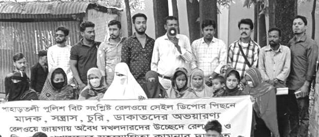 পাহাড়তলী এলাকায় রেলওয়ের ভূমিতে গড়ে উঠা মাদকের স্পট উচ্ছেদের দাবিতে চটগ্রাম বিভাগীয় রেলওয়ে ব্যবস্থাপকের কার্যালয় ঘেরাও করে মানববন্ধন করেছে রেলওয়ে অঞ্চলের সাধারণ এলাকাবাসী। গত রোববার মিছিল নিয়ে চট্টগ্রাম ডিভিশনাল রেলওয়ে ম্যানেজারের কার্যালয় প্রাঙ্গণে মানববন্ধনে যোগদান করেন পাহাড়তলী রেলওয়ের বিভিন্ন এলাকার সমাজ কল্যাণ কমিটি, মসজিদ কমিটি, মন্দির কমিটির নেতৃবৃন্দ, সাধারণ শিক্ষার্থী, যুব সমাজ, ছাত্রলীগ নেতৃবৃন্দসহ সাধারণ এলাকাবাসী। এ সময় চটগ্রাম ডিভিশনাল রেলওয়ে ম্যানেজার আবিদুর রহমানের হাতে স্মারকলিপি হস্তান্তর করেন প্রীতিলতা স্মৃতি সংরক্ষণ কমিটির আহ্বায়ক মহিন উদ্দিন, সদস্য সচিব লিটন চৌধুরী রিংকু, ইউছুফ রশীদি, মোক্তার হোসেন, মহিউদ্দিন সাগর, বিপ্লব দাশ, জাবেদ হোসেন, শরীফুদ্দিন সোহাগ প্রমুখ। গণস্বাক্ষর সহ স্মারকলিপি হস্তান্তর করলে খুব দ্রুত সময়ের মধ্যে এলাকাবাসীকে সাথে নিয়ে মাদক, চুরি ও ছিনতাইয়ের আতুরঘর স্ক্র্যাব কলোনি উচ্ছেদ করবেন বলে উপস্থিত নেতৃবৃন্দকে আশ্বাস দেন বিভাগীয় রেলওয়ে ব্যবস্থাপক আবিদুর রহমান। মানববন্ধনে বক্তারা বলেন, পাহাড়তলী এলাকায় যেখান থেকে প্রীতিলতা, সূর্যসেন, বিনোদ বিহারীর মতো সূর্যসন্তানদের নেতৃত্বে ব্রিটিশ বিরোধী আন্দোলনের সূত্রপাত ঘটে, যাদের স্মৃতি আমরা পাহড়তলীবাসী আজ পর্যন্ত গভীর শ্রদ্ধার সাথে স্মরণ করি। অথচ এই পাহাড়তলী রেলওয়ে এলাকার নান্দনিক পরিবেশ আজ ধ্বংসের মুখে। উন্মুক্ত মাদকের আখড়ায় পরিণত হয়েছে পাহাড়তলী এলাকা। প্রেস বিজ্ঞপ্তি।