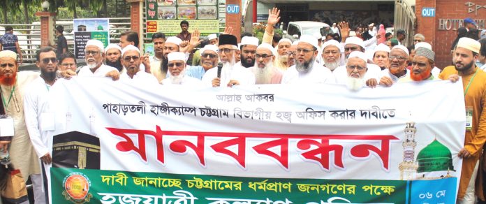 হজযাত্রী কল্যাণ পরিষদের উদ্যোগে পাহাড়তলী হাজী ক্যাম্পকে চট্টগ্রাম বিভাগীয় হজ অফিস করার দাবিতে গতকাল শনিবার নগরীর স্টেশন রোডে মানববন্ধন কর্মসূচি পালিত হয়। পরিষদের সভাপতি আহমদুল ইসলাম চৌধুরীর সভাপতিত্বে মানববন্ধনে বক্তারা বলেন, হজ্বযাত্রী কল্যাণ পরিষদের জোরালো যৌক্তিক দাবিকে গুরুত্ব দিয়ে প্রধানমন্ত্রীর ইতিবাচক সিদ্ধান্তকে অবিলম্বে বাস্তবায়ন করা চট্টগ্রাম বিভাগীয় হজ্ব যাত্রীদের প্রাণের দাবি। এতে বক্তব্য রাখেন পরিষদের মহাসচিব অধ্যক্ষ ডা. আবদুল করিম, প্রফেসর ড. একেএম সাইফুদ্দিন, সালেহ আহমেদ সুলেমান, অধ্যাপক শাহাদৎ হোসাইন, মুহাম্মদ ইদ্রিছ , আবু মোহাম্মদ নুরুল ইসলাম, মুহাম্মদ শরীফ, কাজী মোহাম্মদ শিহাব উদ্দিন, অধ্যাপক যাহেদুর রহমান জাহেদ, অধ্যক্ষ ডা. মো. নুরুল আমিন প্রমুখ। এর আগে সকাল ৯টায় নগরীর স্টেশন রোডস্থ একটি হোটেল হজ্বযাত্রীদের কল্যাণে প্রজেক্টরের মাধ্যমে হজ্ব প্রশিক্ষণ ও সেমিনারের আয়োজন করা হয়। আহমদুল ইসলাম চৌধুরীর সভাপতিত্বে এতে স্বাগত বক্তব্য রাখেন সংগঠনের মহাসচিব অধ্যক্ষ ডা. আবদুল করিম। ডা. সালেহ আহমেদ সুলেমানের উপস্থাপনায় এতে বক্তব্য রাখেন ইসলামী ফাউন্ডেশনের বিভাগীয় পরিচালক বোরহান উদ্দীন। প্রজেক্টরের মাধ্যমে প্রশিক্ষণ দেন ঢাকা থেকে আগত মুহাম্মদ তানভীর হোসেন। বক্তব্য রাখেন অধ্যাপক যাহেদুর রহমান জাহেদ, আবু মো. নুরুল ইসলাম, অধ্যক্ষ ডা. মো. নুরুল আমিন, মো. নাঈম মুফাজ্জল হায়দার, মু. ইদ্রিছ। মোনাজাত পরিচালনা করেন কাজী মাওলানা সিহাব উদ্দীন। প্রেস বিজ্ঞপ্তি।
