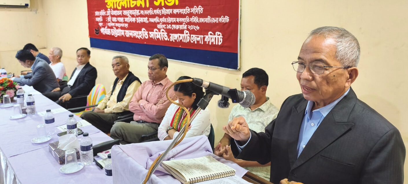 গতকাল রোববার দুপুরে রাঙামাটি জেলা শহরের নিউ মার্কেট এলাকার একটি হলরুমে পার্বত্য চট্টগ্রাম জনসংহতি সমিতির ৫৪তম প্রতিষ্ঠাবার্ষিকী উপলক্ষে এক আলোচনা সভায় তিনি এসব কথা বলেন। ‘বিভেদপন্থী ও জুম্ম স্বার্থ পরিপন্থী সকল ষড়যন্ত্র প্রতিরোধ করুন; পার্বত্য চট্টগ্রাম চুক্তি বাস্তবায়নের লক্ষে বৃহত্তর আন্দোলন সামিল হোন’ এ স্লোগানে প্রতিষ্ঠাবার্ষিকীর আলোচনা সভা অনুষ্ঠিত হয়।