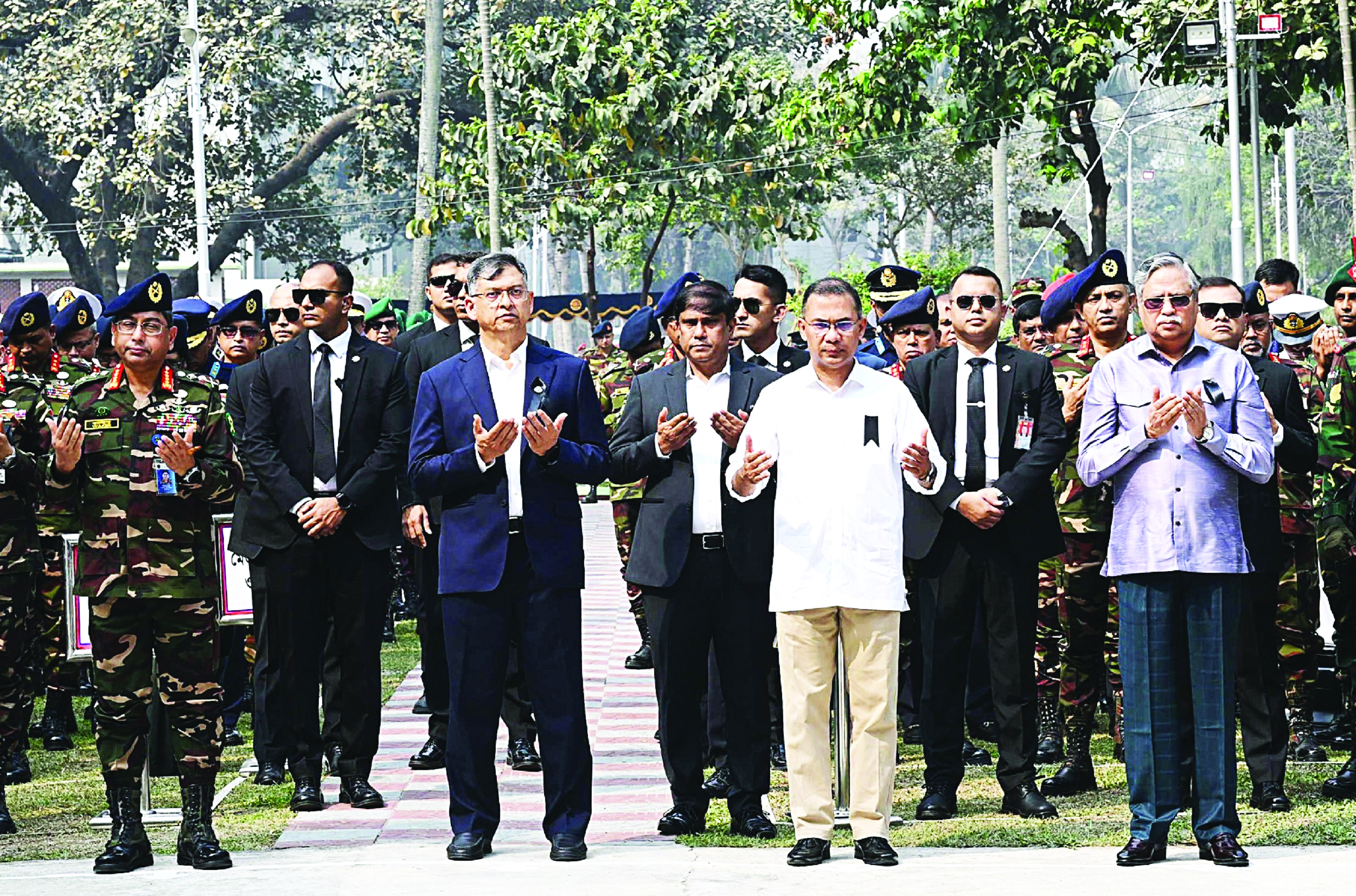 এর আগে সকাল ১০টার দিকে বনানীর সামরিক কবরস্থানে আসেন প্রধানমন্ত্রী তারেক রহমান। কিছুক্ষণ পরেই আসেন রাষ্ট্রপতি মো. সাহাবুদ্দিন। তাকে স্বাগত জানান প্রধানমন্ত্রী তারেক রহমান। এরপর শহীদ সেনা কর্মকর্তাদের স্মৃতিস্তম্ভে পুষ্পস্তবক অর্পণের মাধ্যমে তাঁদের প্রতি শ্রদ্ধা জানানো হয়। পুষ্পস্তবক অর্পণ শেষে রাষ্ট্রপতি ও প্রধানমন্ত্রী কিছুক্ষণ নীরবে দাঁড়িয়ে থাকেন। এ সময় সশস্ত্র বাহিনীর একটি চৌকস দল সামরিক রীতিতে সম্মান প্রদর্শন করে। বিউগলে বেজে ওঠে করুণ সুর। এরপর তাঁরা শহীদদের রুহের মাগফিরাত কামনা করে বিশেষ মোনাজাতে অংশ নেন।