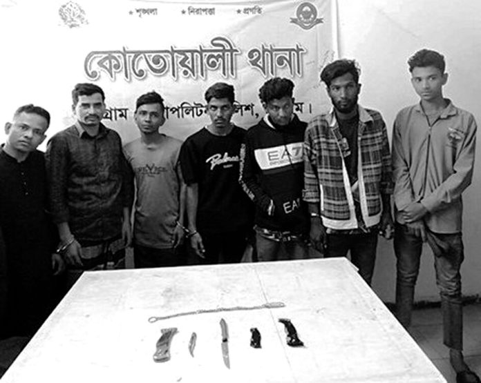ডাকাতির প্রস্তুতি নেওয়ার সময় নগরীর পুরাতন রেলওয়ে স্টেশন এলাকা থেকে দেশীয় অস্ত্রসহ ৭ জনকে গ্রেপ্তার করেছে পুলিশ। তারা হলেন মো. আলমগীর হোসেন প্রকাশ আলম, মো. তসলিম, মো. রাসেল, আরাফাত হোসেন, মো. আয়াত বাদশা, মো. হাসান ও মো. হৃদয়। গত রোববার রাতে পুরাতন রেলওয়ে স্টেশন গ্রামীণ মাঠ নার্সারি–সংলগ্ন খালি জায়গা থেকে বিভিন্ন দেশীয় অস্ত্রসহ তাদেরকে গ্রেপ্তার করা হয়।