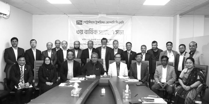 পেট্রোলিয়াম ট্রান্সমিশন কোম্পানি পিএলসির (পিটিসি পিএলসি) ৩য় বার্ষিক সাধারণ সভা গতকাল বৃহস্পতিবার কোম্পানির ঢাকা লিয়াজোঁ অফিসে অনুষ্ঠিত হয়। সভায় সভাপতিত্ব করেন কোম্পানির পরিচালনা পর্ষদের চেয়ারম্যান এ টি এম ফজলুল করিম। সভায় উপস্থিত ছিলেন বাংলাদেশ পেট্রোলিয়াম কর্পোরেশনের চেয়ারম্যান মো. আমিন উল আহসান। সভায় পিটিসি পিএলসির পরিচালনা পর্ষদের সদস্য হিসেবে উপস্থিত ছিলেন যুগ্মসচিব (অর্থ বিভাগ) ড. মো. ফেরদৌস আলম, বিপিসির পরিচালক ড. এ কে এম আজাদুর রহমান, যুগ্মসচিব নাজনীন পারভীন, যুগ্ম সচিব মো. অলিউর রহমান, যুগ্মসচিব মুহাম্মদ আশরাফ হোসেন, উপসচিব শাহিনা সুলতানা, বিপিসির সাবেক ঊর্ধ্বতন মহাব্যবস্থাপক মুস্তফা কুদরুত–ই–ইলাহী, ঊর্ধ্বতন মহাব্যবস্থাপক (হিসাব), এ. টি. এম. সেলিম, পিটিসির ব্যবস্থাপনা পরিচালক রিায়হান আহমাদ।