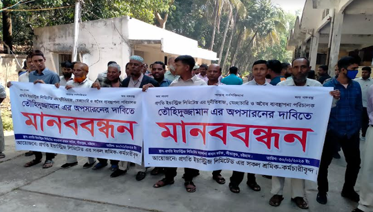 রাষ্ট্রায়ত্ত গাড়ি প্রস্তুতকারক প্রতিষ্ঠান প্রগতি ইন্ডাস্ট্রিজ লিমিটেডের ব্যবস্থাপনা পরিচালক তৌহিদুজ্জামানের অপসারণের দাবিতে মানববন্ধন কর্মসূচি পালন করেছে শ্রমিক কর্মচারীরা। গতকাল সোমবার দুপুরে উপজেলার বাড়বকুণ্ডে কারখানাটির মূল ফটকের সামনে অবস্থান নিয়ে প্রগতির বিক্ষুব্ধ শ্রমিক–কর্মচারীরা এ মানববন্ধন কর্মসূচি পালন করেন।