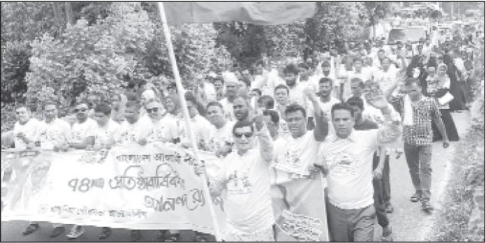 সেখানে সাংস্কৃতিক অনুষ্ঠান পরিবেশিত হয়। র্যালিটি উপজেলা কমপ্লেক্স ঘুরে কাপ্তাই সড়কের ইছাখালী, ঘাটচেক, রোয়াজারহাট প্রদক্ষিণ শেষে থানা সদরে গিয়ে সমাবেশ অনুষ্ঠিত হয়। সমাবেশে সভাপতিত্ব করেন রাঙ্গুনিয়া পৌরসভা আওয়ামী লীগের সভাপতি আরিফুল ইসলাম চৌধুরী। সাধারণ সম্পাদক মোহাম্মদ সেলিমের সঞ্চালনায় এতে প্রধান অতিথি ছিলেন উত্তরজেলা আওয়ামী লীগের সহ সভাপতি স্বজন কুমার তালুকদার। বিশেষ অতিথি ছিলেন উত্তরজেলা আওয়ামী লীগের সহ সভাপতি আবুল কাশেম চিশতি, সদস্য আকতার হোসেন খান, রাঙ্গুনিয়া মুক্তিযোদ্ধা সংসদের কমান্ডার খাইরুল বশর মুন্সি প্রমুখ।