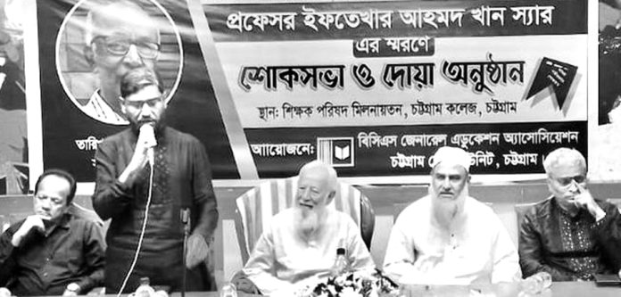বিসিএস জেনারেল এডুকেশন অ্যাসোসিয়েশনের প্রাক্তন সভাপতি, চট্টগ্রাম কলেজ ও স্যার আশুতোষ সরকারি কলেজের প্রাক্তন অধ্যক্ষ প্রফেসর ইফতেখার আহমদ খানের স্মরণে শোকসভা এবং দোয়া মাহফিল ২৭ সেপ্টেম্বর বিকেল ৪টায় চট্টগ্রাম কলেজের শিক্ষক মিলনায়তনে অনুষ্ঠিত হয়। অনুষ্ঠানে সভাপতিত্ব করেন বিসিএস জেনারেল এডুকেশন অ্যাসোসিয়েশন চট্টগ্রাম জেলা ইউনিটের সভাপতি এবং সরকারি সিটি কলেজ চট্টগ্রামের উপাধ্যক্ষ প্রফেসর জসিম উদ্দিন আহমেদ। অ্যাসোসিয়েশনের প্রাক্তন কেন্দ্রীয় সভাপতি প্রফেসর কফিল উদ্দিন আহমেদ, প্রফেসর আই কে সেলিমুল্লাহ খন্দকারসহ বিভিন্ন সরকারি কলেজের বর্তমান এবং প্রাক্তন অধ্যক্ষবৃন্দ অনুষ্ঠানে উপস্থিত ছিলেন। বিসিএস জেনারেল এডুকেশন ক্যাডারের বিভিন্ন স্তরে কর্মরত সরকারি কলেজের শিক্ষকবৃন্দ এবং অ্যাসোসিয়েশনের চট্টগ্রাম জেলা ইউনিটের নির্বাচিত নেতৃবৃন্দ অনুষ্ঠানে উপস্থিত ছিলেন।