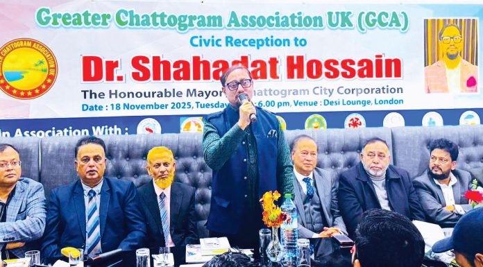 গ্রেটার চট্টগ্রাম এসোসিয়েশন ইউকের উদ্যোগে গত ১৮ নভেম্বর লন্ডন সফররত সিটি মেয়র ডা. শাহাদাত হোসেনকে পূর্ব লন্ডনের দেশি লাউঞ্জ রেস্টুরেন্টে আড়ম্বরপূর্ণ নাগরিক সংবর্ধনা প্রদান করা হয়। এতে লন্ডনে বসবাসরত চট্টগ্রামবাসী ছাড়াও বাংলাদেশি কমিউনিটির অনেক নেতৃবৃন্দ উপস্থিত ছিলেন।