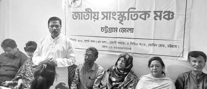 জাতীয় সাংস্কৃতিক মঞ্চ চট্টগ্রাম শাখার মতবিনিময় সভা গত ২৯ মে চেরাগী পাহাড়স্থ লুসাই ভবনে সংগঠনের সভাপতি কামরুল হুদার সভাপতিত্বে ও সাধারণ সম্পাদক নজরুল ইসালামের সঞ্চালনায় অনুষ্ঠিত হয়। এতে প্রধান অতিথি ছিলেন সংগঠনের প্রধান উপদেষ্টা ফজল আহমদ। বক্তব্য রাখেন শাহিদা আকতার জাহান, দীপক কুমার পালিত, লূপর্ণা মুৎসূর্দ্দী লোপা, আফরোজা বেগম জলি, অধ্যাপক এ কে এম নুরুল বশর সুজন, নজরুল ইসলাম সাদা, অধ্যাপক ওচমান জাহাঙ্গীর, মো. হোসেন আলী, গীতা আচার্য্য, সুকুমার দে, এয়াকুব আলী, শ্যামল দাশ, সোমা মুৎসুদ্দী, ওমর ফারুক, মানস চৌধুরী, অ্যাডভোকেট সেলিম চৌধুরী, রোপি দাশ সুমি, সংগীতি শিল্পী অচিন্ত্য কুমার দাশ, রোকন উদ্দীন আহমেদ,সাইফী আনোয়ারুল আজিম, ইমতিয়াজ ফারুকী, শিব্বির আহমদ ওসমান, আরিফুল ইসলাম মো. ওসমান গণি, রাধা রানী চৌধুরী, সৈয়দ কুতুব উদ্দীন ফোরকান, তানভীর আহমদ,অ্যাডভোকেট অস্মিত চক্রবর্তী, রফিকুল ইসলাম, রুপনা দাশ, আকতার হোসাইন, ইশাত মান্নান, আমিনুল হক লিটন প্রমুখ।