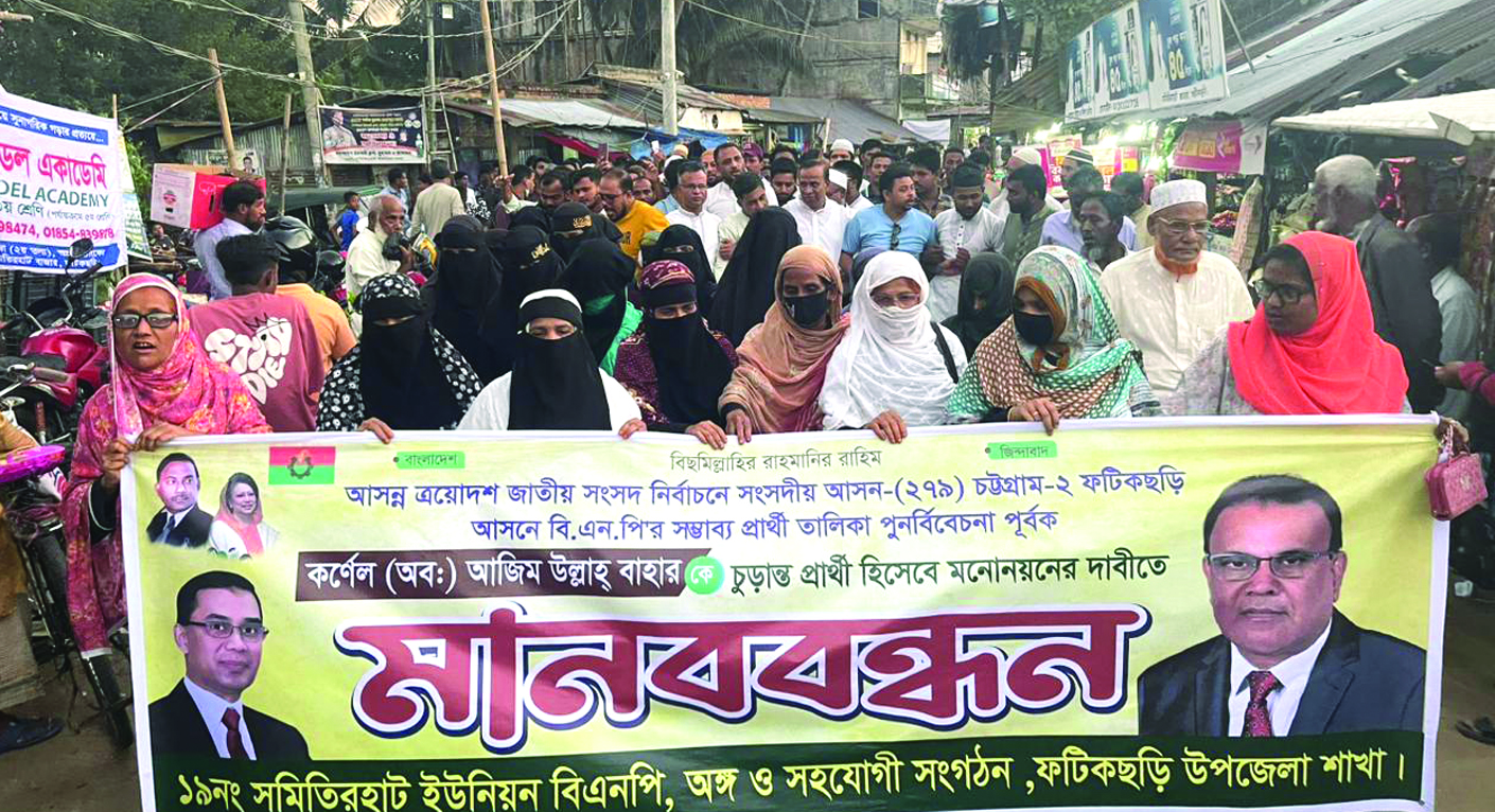 চট্টগ্রাম–২ (ফটিকছড়ি) আসনে উপজেলা বিএনপির আহবায়ক কর্নেল (অব.) আজিম উল্লাহ বাহারকে দলীয় মনোনয়ন না দেওয়ায় মানববন্ধন ও মিছিল করেছে ফটিকছড়ির সমিতিরহাট ইউনিয়ন বিএনপি ও এর অঙ্গ–সহযোগী সংগঠনের নেতৃবৃন্দ। ১৪ নভেম্বর ২০২৫ (শুক্রবার) বিকাল ৩টা থেকে সমিতিরহাট বাজারে অনুষ্ঠিত মানববন্ধনে অংশগ্রহণ করেন ইউনিয়ন বিএনপি, যুবদল, স্বেচ্ছাসেবক দল, ছাত্রদলসহ বিভিন্ন অঙ্গ সংগঠনের হাজারো নেতাকর্মী। এসময় বক্তারা বলেন, “কর্নেল (অব.) আজিম উল্লাহ বাহার একজন ত্যাগী, নিবেদিতপ্রাণ ও যোগ্য রাজনীতিবিদ। তিনি দীর্ঘদিন ধরে ফটিকছড়ির সাধারণ মানুষের পাশে থেকে দল ও এলাকার কল্যাণে কাজ করে যাচ্ছেন। দলের সংকটময় সময়ে তিনি মাঠে থেকে দায়িত্ব পালন করেছেন, যা তৃণমূলের কাছে তাঁকে আরও জনপ্রিয় করেছে।”