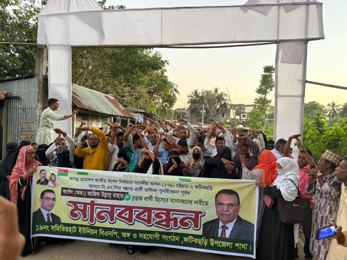 চট্টগ্রামের ফটিকছড়ি-২ আসনে বিএনপি’র মনোনয়ন পরিবর্তনের দাবিতে মানববন্ধন ও বিক্ষোভ র্যালি করেছে উপজেলাটির তৃণমূল নেতাকর্মীরা। শুক্রবার বিকেলে সমিতির হাট বাজার প্রাঙ্গণে উপজেলার বিভিন্ন ইউনিয়ন থেকে আসা বিএনপি ও অঙ্গসংগঠনের বিভিন্ন পর্যায়ের নেতাকর্মী ও সমর্থকরা এ কর্মসূচিতে অংশ নেন।