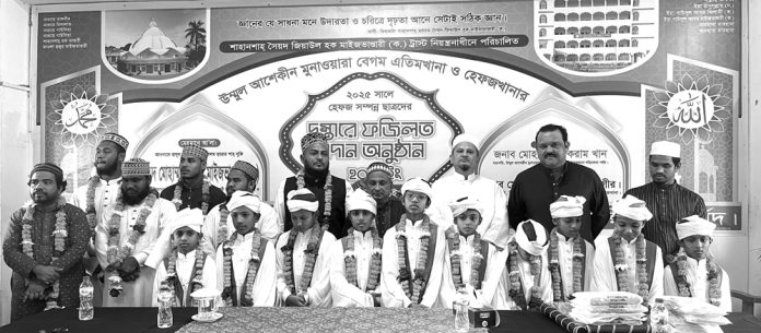 ফটিকছড়ি উপজেলার রোসাংগীরির আজিমনগরস্থ উম্মুল আশেকীন মুনাওয়ারা বেগম এতিমখানা ও হেফজখানার আবাসিক ভবনে ২০২৫ সালে হেফজ সম্পন্নকারী শিক্ষার্থীদের দস্তারে ফজিলত প্রদান অনুষ্ঠান গতকাল শনিবার অনুষ্ঠিত হয়। বাংলাদেশ ক্রিকেট দলের সাবেক অধিনায়ক আকরাম খানের সভাপতিত্বে এতে প্রধান অতিথি ছিলেন দরবারে গাউসুল আযম মাইজভাণ্ডারী গাউসিয়া হক মনজিলের সাজ্জাদানশীন সৈয়দ মোহাম্মদ হাসান মাইজভাণ্ডারী। বিশেষ অতিথি ছিলেন চট্টগ্রাম–২ (ফটিকছড়ি) আসনের সংসদ সদস্য পদপ্রার্থী মোহাম্মদ সরোয়ার আলমগীর। প্রধান অতিথি বলেন, আজ যারা হাফেজে কুরআন হয়েছে তারা শুধু একটি প্রতিষ্ঠানের গর্ব নয়, সমগ্র উম্মাহর গৌরব। কুরআন হিফজ আল্লাহর বিশেষ নিয়ামত, যার মাধ্যমে তিনি দ্বীনকে সংরক্ষণ করে থাকেন। বক্তব্য রাখেন অধ্যক্ষ আবুল কাছেম, সৈয়দ মোরশেদুল আমিন, হাফেজ মুহাম্মদ এরশাদ, হাফেজ আবুল কালাম। উপস্থিত ছিলেন বলাই কুমার আচার্য্য, কাজী মোহাম্মদ ইউসুফ, মকসুদুর রহমান হাসনু, কাজী নিজাম উদ্দীন, মাস্টার বটন কুমার দে, সৈয়দ সাকলাইন মাহমুদ, ডাক্তার সামিয়ুল করিম, জালাল উদ্দিন, শাফায়াত হোসেন, রাশেদ আলী, হাফেজ মহি উদ্দিন, হাফেজ আবু হানিফ, হাফেজ ইরফানুল ইসলাম প্রমুখ। শেষ পর্বে হেফজ সম্পন্নকারী ১০ জন শিক্ষার্থীর মাথায় পাগড়ি পরিয়ে দস্তারে ফজিলত প্রদান করা হয়। মুনাজাত পরিচালনা করেন মাওলানা নুরুল ইসলাম ফোরকানী।