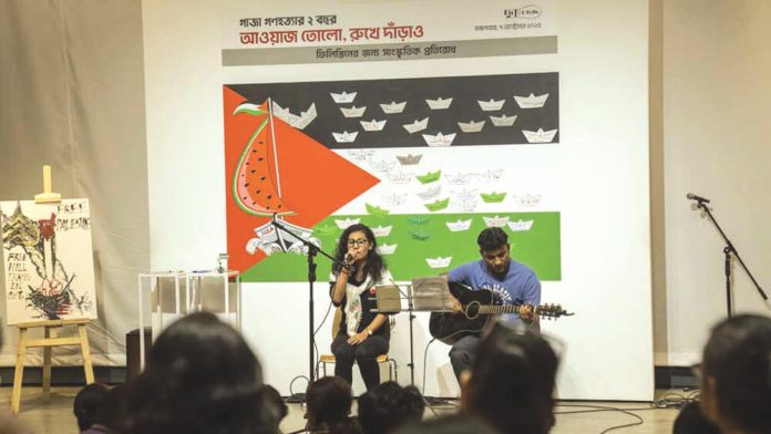 সন্ধ্যা ৬টায় গান, কবিতার মাধ্যমে ফিলিস্তিনের লোকজনের পক্ষে এবং ইসরায়েলের আধিপত্যবাদের বিরুদ্ধে রুখে দাঁড়ানো ও আওয়াজ তোলার এই আয়োজনটি শুরু হয়। এতে গান পরিবেশন করেন সংগীতশিল্পী সায়ান, মুয়ীজ মাহফুজ, সূচী মারমা ও ব্যান্ড সমগীত। কবিতাপাঠে অংশগ্রহণ করেন ফেরদৌস আরা রুমী, রুম্মানা জান্নাত, মুনিমাহ মাহরিন, জাহিদ জগৎ, সোনিয়া হাসান, সৈকত আমীন, অরূপ রাহী, সৈয়দ মুসা রেজা, ফায়েজা রামীম, শায়েখ সোয়েব ও তাহমীদ চৌধুরী। খবর বিডিনিউজের।