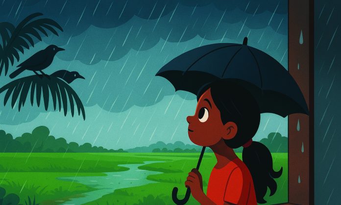 সকালে ঘুম ভাঙতেই বর্ণমালা শুনল, টুপটাপ বৃষ্টির শব্দ। জানালার পাশে এসে দাঁড়াতেই দেখে–চারদিকের পরিবেশ কেমন যেন গুমোট হয়ে আছে, দিগন্তজোড়া সবুজ মাঠ, আর তার ওপর মেঘলা আকাশ। তালগাছের মাথায় জল বেয়ে পড়ছে, কাকগুলো পাতার আড়ালে বসে ঠুকঠুক শব্দে ডাকছে।