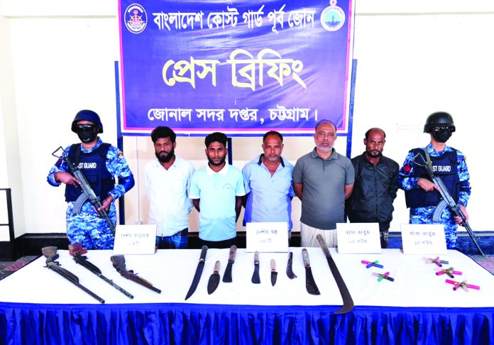 বাঁশখালীতে বাংলাদেশ কোস্ট গার্ড অভিযান চালিয়ে অস্ত্রসহ ‘মনসুর বাহিনী’র ৫ জন সন্ত্রাসীকে আটক করেছে। এ সময় তাদের কাছ থেকে ৩টি দেশীয় অস্ত্র, ৮ রাউন্ড তাজা কার্তুজ, ১৫টি ফাঁকা কার্তুজ ও দা–চুরি জব্দ করা হয়। আটককৃতরা হলেন, আবু নছর চৌধুরী (৪৪), আব্দুল কাদের (৪০), মো. জমির আহমদ (৫৫), মো. জিয়াউর রহমান (৫০) ও মো. সোহেল (২১)। সবাই বাঁশখালী থানার বিভিন্ন এলাকার বাসিন্দা। কোস্ট গার্ড সূত্রে জানা যায়, গোপন সংবাদের ভিত্তিতে গতকাল বৃহস্পতিবার ভোর রাত ৩টা থেকে সকাল ৬টা পর্যন্ত কোস্ট গার্ড বেইজ চট্টগ্রামের একটি বিশেষ দল বাঁশখালী থানাধীন নতুন বাজার সংলগ্ন এলাকায় অভিযান চালায়। অভিযানের সময় একদল সন্ত্রাসী কোস্ট গার্ড দলের গাড়িতে অতর্কিত হামলা চালিয়ে গাড়ি ভাঙচুর করে ও আটক আসামিদের ছিনিয়ে নেওয়ার চেষ্টা করে। এসময় আত্মরক্ষার্থে কোস্ট গার্ড সদস্যরা ৩ রাউন্ড ফাঁকা গুলি ছোড়ে। জব্দ করা অস্ত্র ও আটককৃতদের বিরুদ্ধে আইনানুগ ব্যবস্থা গ্রহণের প্রক্রিয়া চলছে বলে জানিয়েছে কোস্ট গার্ড। বাংলাদেশ কোস্ট গার্ডের মিডিয়া কর্মকর্তা লে. কমান্ডার মো. সিয়াম–উল–হক জানান, সন্ত্রাস ও চাঁদাবাজি দমনে কোস্ট গার্ডের অভিযান অব্যাহত থাকবে। দেশের উপকূলীয় এলাকায় শান্তি ও নিরাপত্তা রক্ষায় আমরা সর্বদা সচেষ্ট।