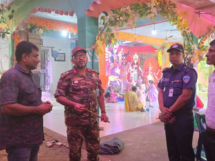 শারদীয় দুর্গোৎসবকে কেন্দ্র করে আইনশৃঙ্খলা রক্ষাকারী বাহিনীর সকল স্তরের নিরাপত্তা কার্যক্রম চলমান রয়েছে। বিগত বছরের ন্যায় এ বছরও সেনাবাহিনী, পুলিশ ও প্রশাসনের সম্মিলিত জোরদার নজরদারি ও টহল কার্যক্রম বিদ্যমান রয়েছে। এরই ধারাবাহিকতায় সেনাবাহিনীর কর্মকর্তারা মণ্ডপ পরিদর্শন করেন।