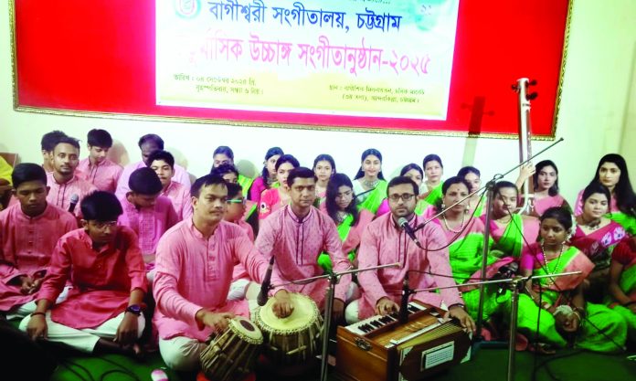 চট্টগ্রামের সংগীতচর্চার ঐতিহ্যবাহী ধারাকে এগিয়ে নিতে নিরলসভাবে কাজ করে চলেছে বাগীশ্বরী সংগীতালয়। সেই ধারাবাহিকতায় গত বৃহস্পতিবার সন্ধ্যা ৬টায় আন্দরকিল্লাস্থ বাগীশিক মিলনায়তনে আয়োজিত হয় প্রতিষ্ঠানটির চতুর্মাসিক উচ্চাঙ্গ সংগীতানুষ্ঠান। অনুষ্ঠানে সম্মানিত অতিথি ছিলেন আর্য্য সংগীত সমিতির উপাধ্যক্ষ অধ্যাপিকা মৃণালিনী চক্রবর্তী। তিনি বলেন, উচ্চাঙ্গ সংগীত কেবল গান নয়– এ এক ধ্যান, এক আত্মিক সাধনা। বাগীশ্বরীর এই প্রয়াস আমাদের নতুন প্রজন্মের মাঝে সেই সাধনার বীজ বপন করছে। অনুষ্ঠানে সম্মানিত অতিথি ছিলেন সাংস্কৃতিক ব্যক্তিত্ব ও শিল্পপতি রিয়াজ ওয়ায়েজ। তিনি বলেন, এই রকম অনুষ্ঠানগুলো শুধুমাত্র সংগীত পরিবেশনার আয়োজন নয়, বরং এক সাংস্কৃতিক দায়িত্ব পালন– যা সমাজ ও প্রজন্মকে শুদ্ধ সংগীতচর্চার দিকে উৎসাহিত করে। আয়োজনে সভাপতিত্ব করেন বাগীশ্বরী সংগীতালয়ের সহ–সভাপতি অধ্যাপিক ঊর্মিলা রাণী ভৌমিক। স্বাগত বক্তব্য রাখেন সংগীতালয়ের অধ্যক্ষ রিষু তালুকদার। শুভেচ্ছা বক্তব্য রাখেন যুগ্ম সম্পাদক সাংবাদিক যীশু সেন। অনুষ্ঠান উদযাপন পরিষদের পক্ষ থেকে বক্তব্য রাখেন সমন্বয়ক ব্যাংকার উৎপল চক্রবর্তী, আহ্বায়ক ডা. সৌমিত্র দাশ, সদস্য সচিব প্রভাষক ঝুমুর খাস্তগীর, প্রকৌশলী রিমন সাহা। সার্বিক সঞ্চালনায় ছিলেন বাচিক শিল্পী অদিতি সাহা। প্রেস বিজ্ঞপ্তি।
